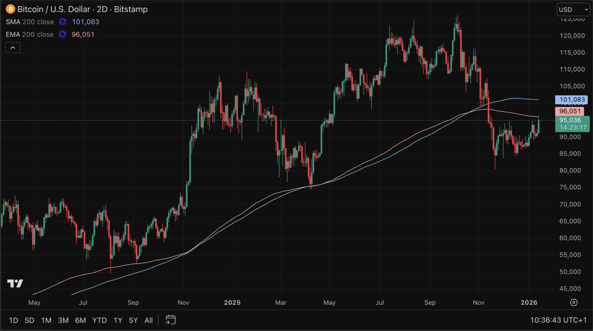 Als Bitcoin deze koerslijn kan heroveren, en vervolgens hetzelfde kan doen voor het 200-perioden exponentiële 2-daagse koersgemiddelde (blauwe lijn), dan mogen de bulls echt weer aan nieuwe all-time highs denken.