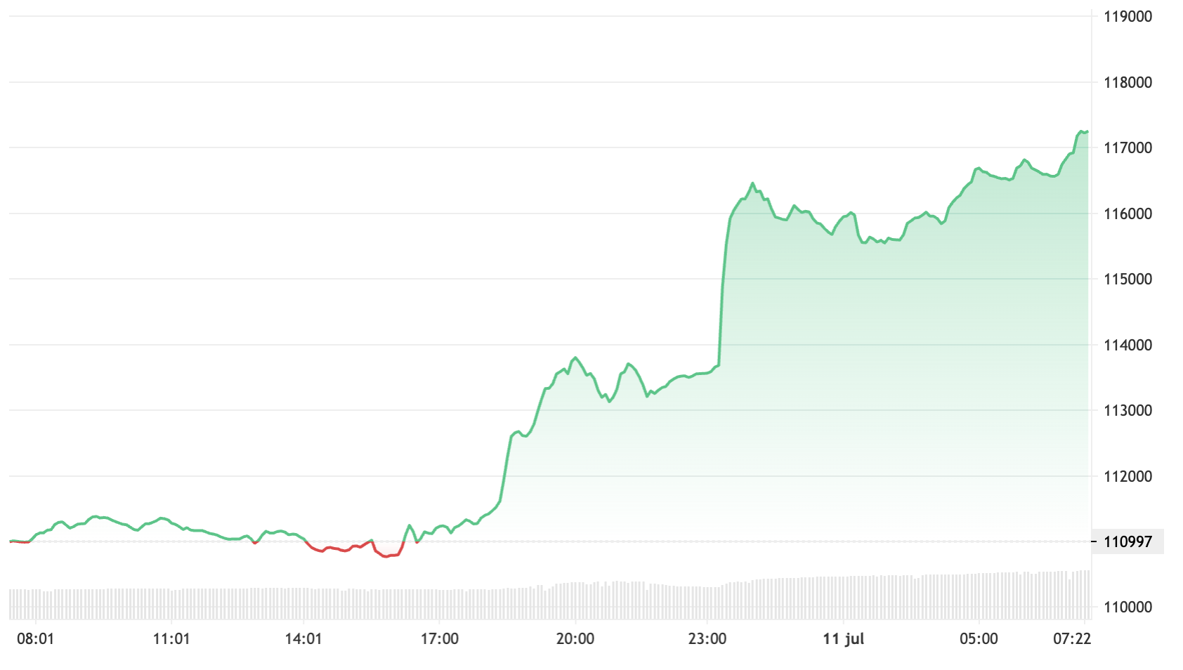 Volgens prijsgegevens van Newsbit staat de BTC koers op het moment van schrijven rond de $117.200. Dat betekent een stijging van 5,9 procent in de afgelopen 24 uur. Slechts een dag eerder tikte Bitcoin al de 112.000 dollar aan, maar zakte daarna weer onder de 111.000 dollar.