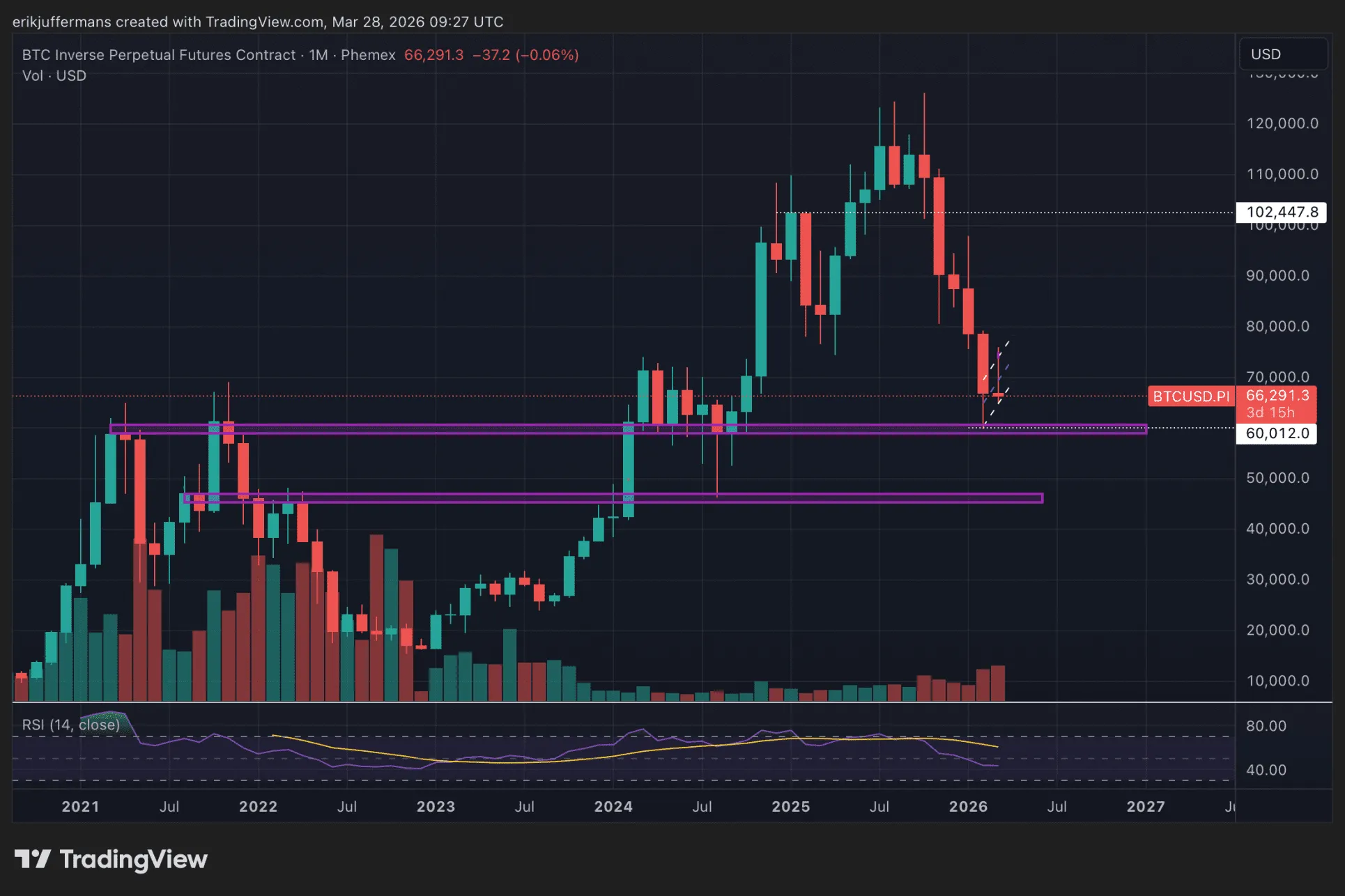 Volgens Juffermans zal de zone rond 60.000 dollar niet snel breken en ligt daar op lange termijn sterke steun. Tegelijk waarschuwt hij dat uitschieters op de maandgrafiek altijd mogelijk blijven, waardoor een tijdelijke dip richting 50.000 dollar niet kan worden uitgesloten.