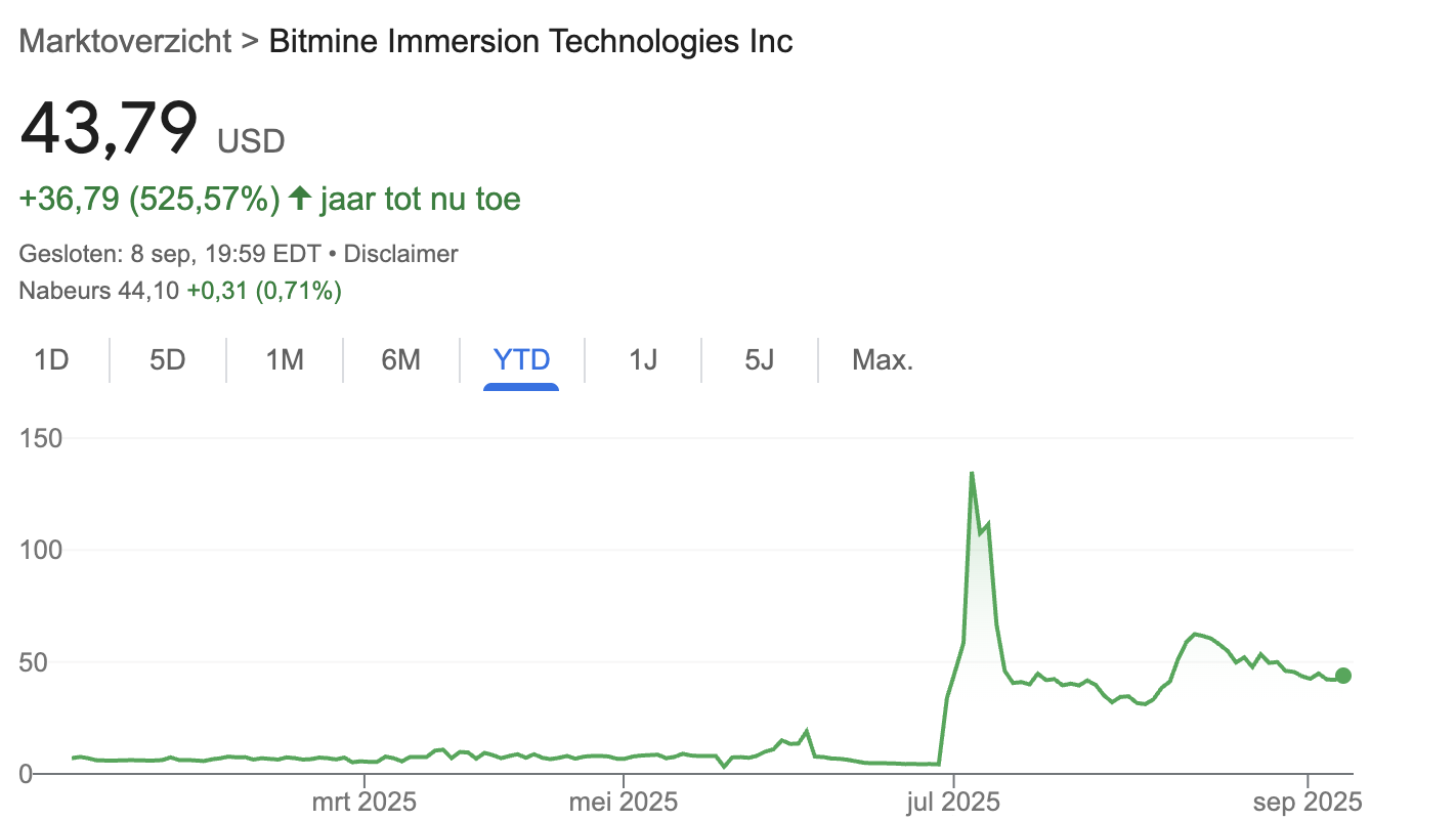 De beurskoers van BitMine reageerde positief. Het aandeel sloot gisteren 4,1 procent hoger op 44,10 dollar. Sinds het begin van dit jaar is de koers zelfs met 525 procent gestegen. Het bedrijf heeft de ambitie uitgesproken om 5 procent van het totale Ether-aanbod in bezit te krijgen. Met 2 miljoen ETH is inmiddels 34 procent van dat doel bereikt.