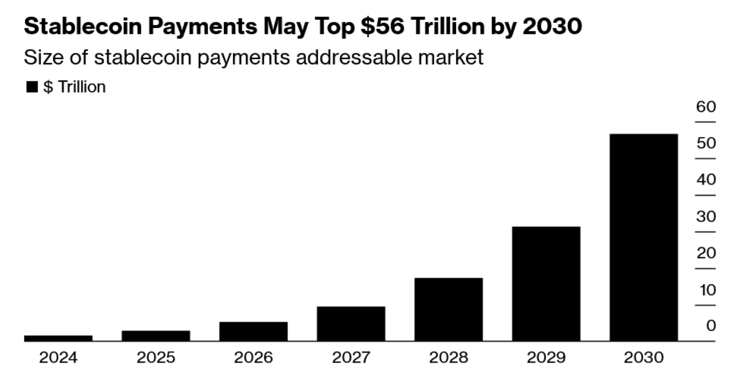 Stablecoins worden wereldwijd steeds vaker ingezet als betaalmiddel. Volgens Bloomberg Intelligence kan het betaalvolume via stablecoins tegen 2030 oplopen tot maar liefst 56 biljoen dollar. Dat zou een stevige verankering in het mondiale financiële systeem betekenen.
