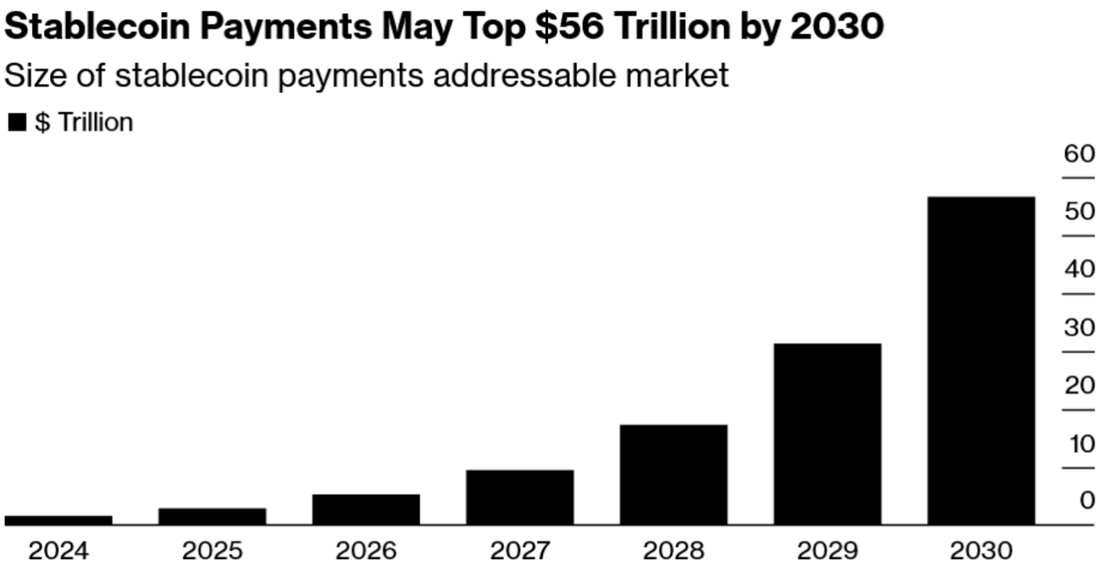 Stablecoins hebben in 2025 een reusachtige ontwikkeling doorgemaakt en groeien in hoog tempo uit tot een belangrijk betaalinstrument binnen het wereldwijde financiële systeem. Volgens nieuwe cijfers van Bloomberg Intelligence kunnen de wereldwijde betalingsstromen in stablecoins tegen 2030 oplopen tot bijna 56 biljoen dollar.