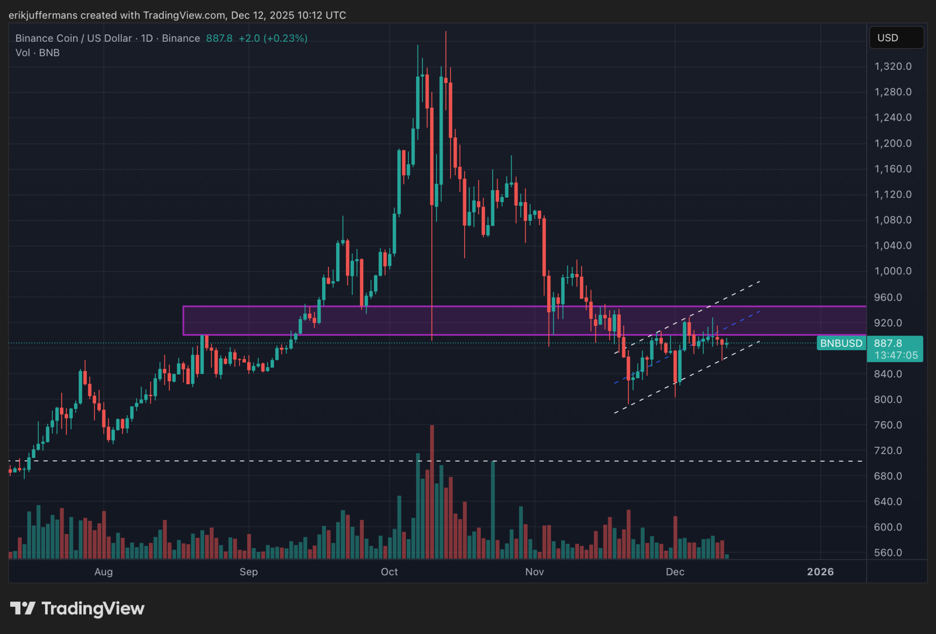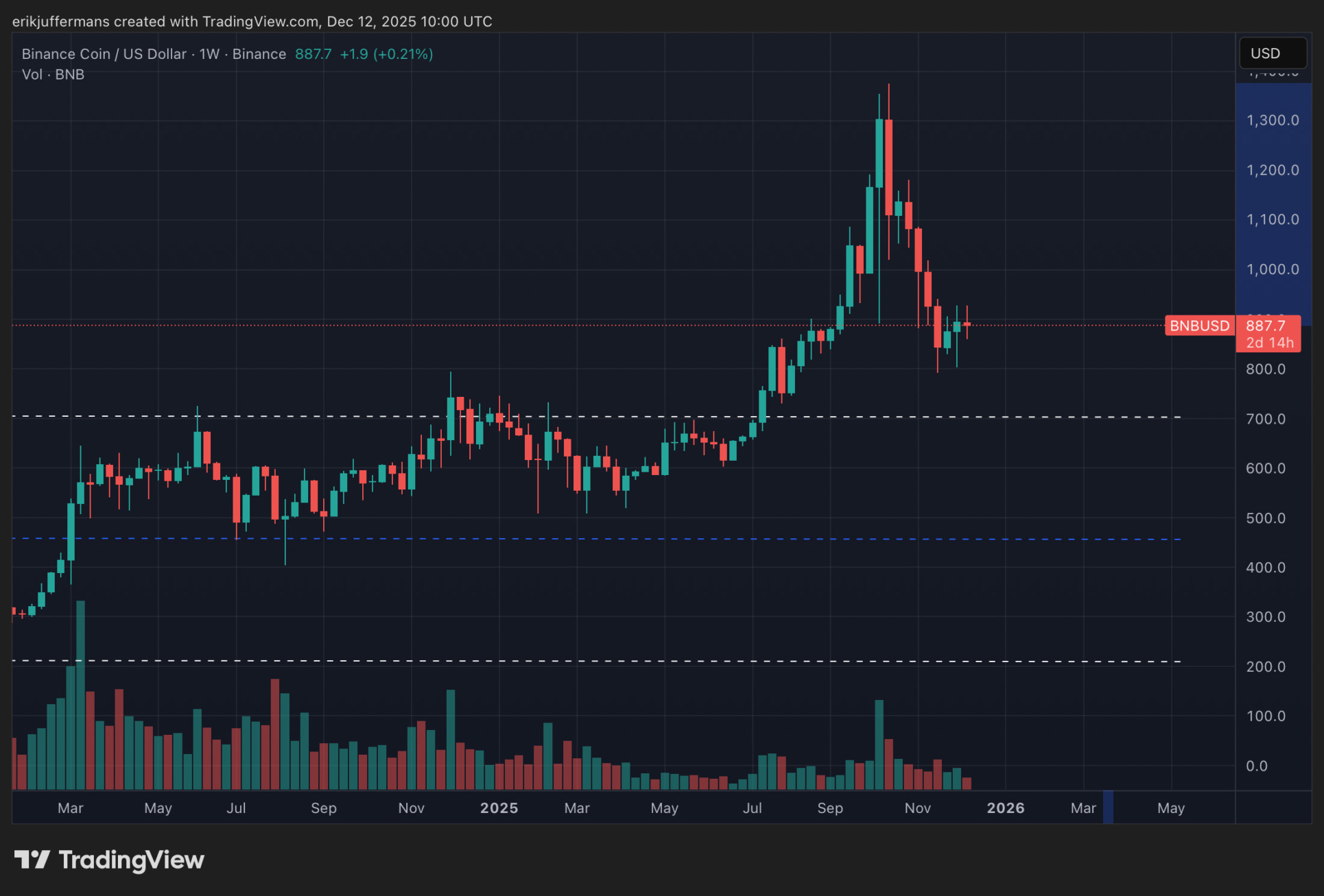 De prijs van Binance Coin (BNB) bereikte in oktober een all-time high van ruim 1400 dollar. Sindsdien is de koers begrijpelijkerwijs flink teruggezakt en handelt momenteel rond de 890 dollar. Dit is een daling van 35 procent vanaf de piek. De grote vraag is wat dit betekent voor het vervolg. Technisch analist Erik Juffermans is de grafieken ingedoken en is niet zo optimistisch.