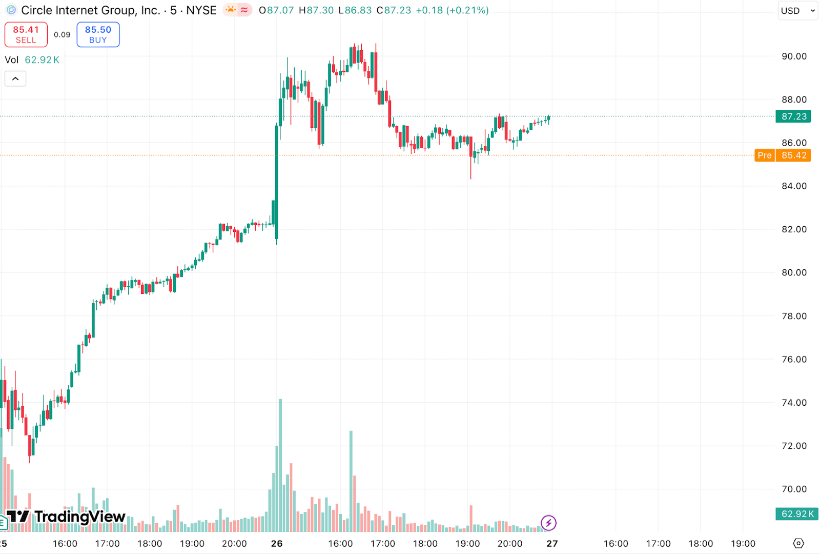 Direct na de publicatie sprong het aandeel op de pre-market met ongeveer 16 procent omhoog. Die trend werd daarna voortgezet. Zo bereikte Circle gisteren een piek van 90,65 dollar.