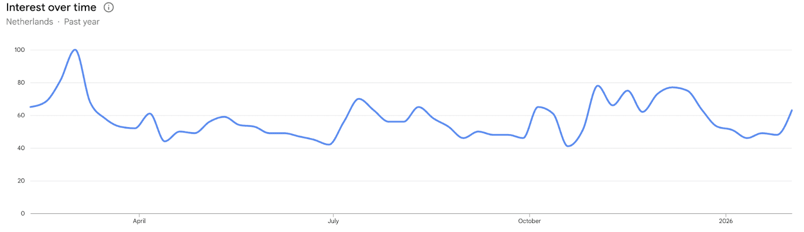 Ook in Nederland daalde de zoekinteresse naar crypto, met een waarde van 48 vorige week. Wat echter opvalt, is dat de trend hier anders verloopt dan wereldwijd.