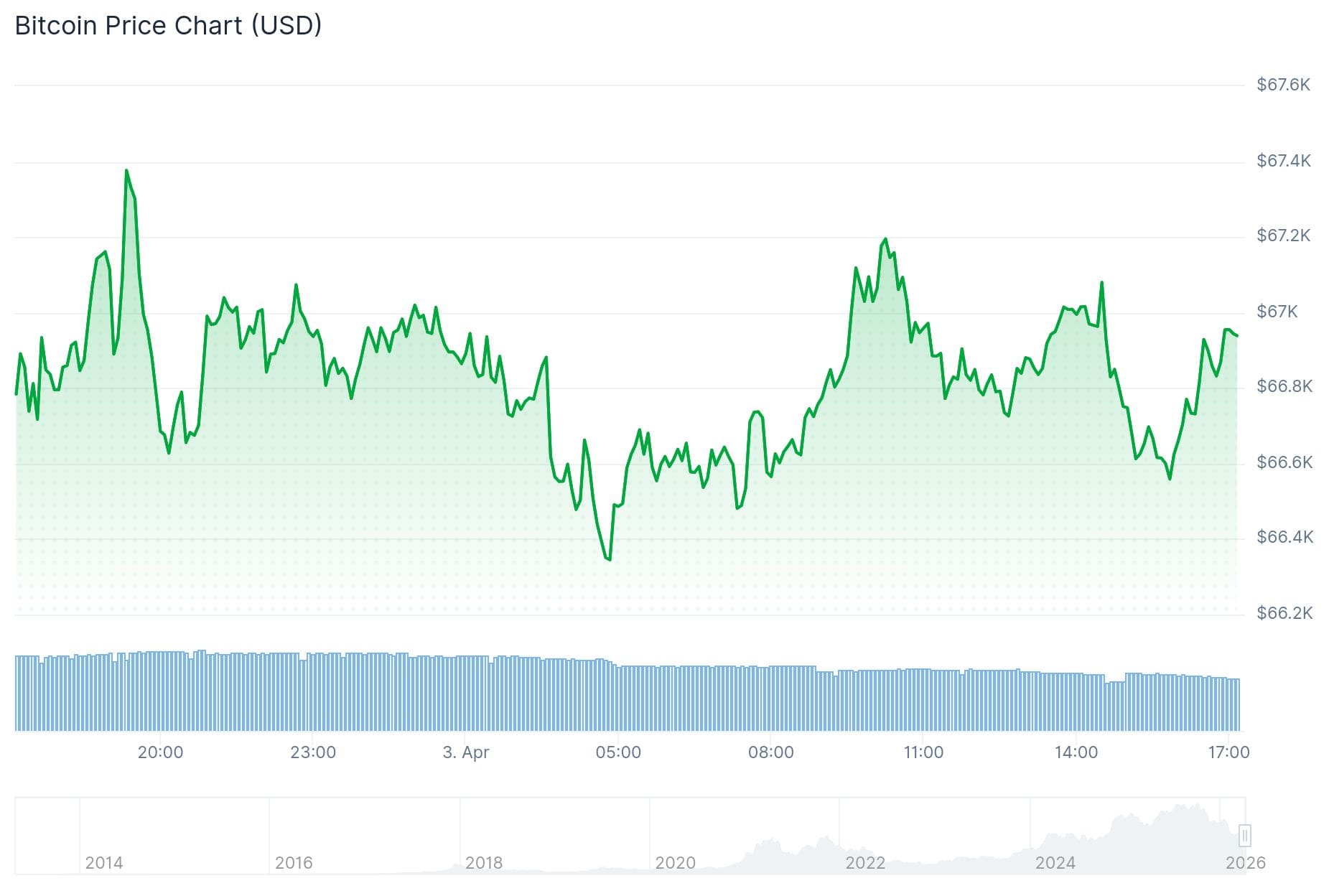 Bitcoin staat nagenoeg op dezelfde koers als gisteren, maar heeft in de tussentijd natuurlijk niet stilgestaan. Vanmorgen rond 10:00 uur werd het hoogste punt van de dag bereikt rond 67.250 dollar en rond 16:00 uur het laagste punt rond 66.500 dollar.