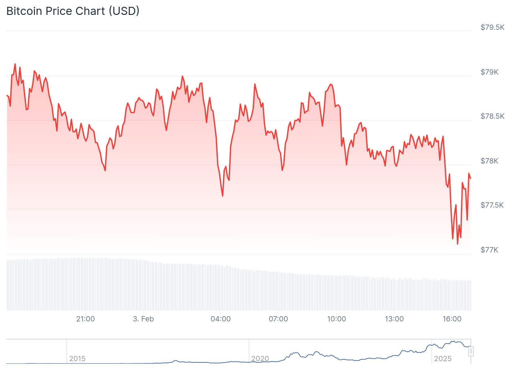 De stijging stopte net boven de 79.000 dollar en ook vandaag is het niet gelukt om verder te komen. Bitcoin heeft vooral zijwaarts bewogen vlak boven de 78.000 dollar, maar na het openen van de Amerikaanse aandelenbeurzen ging het verder omlaag.