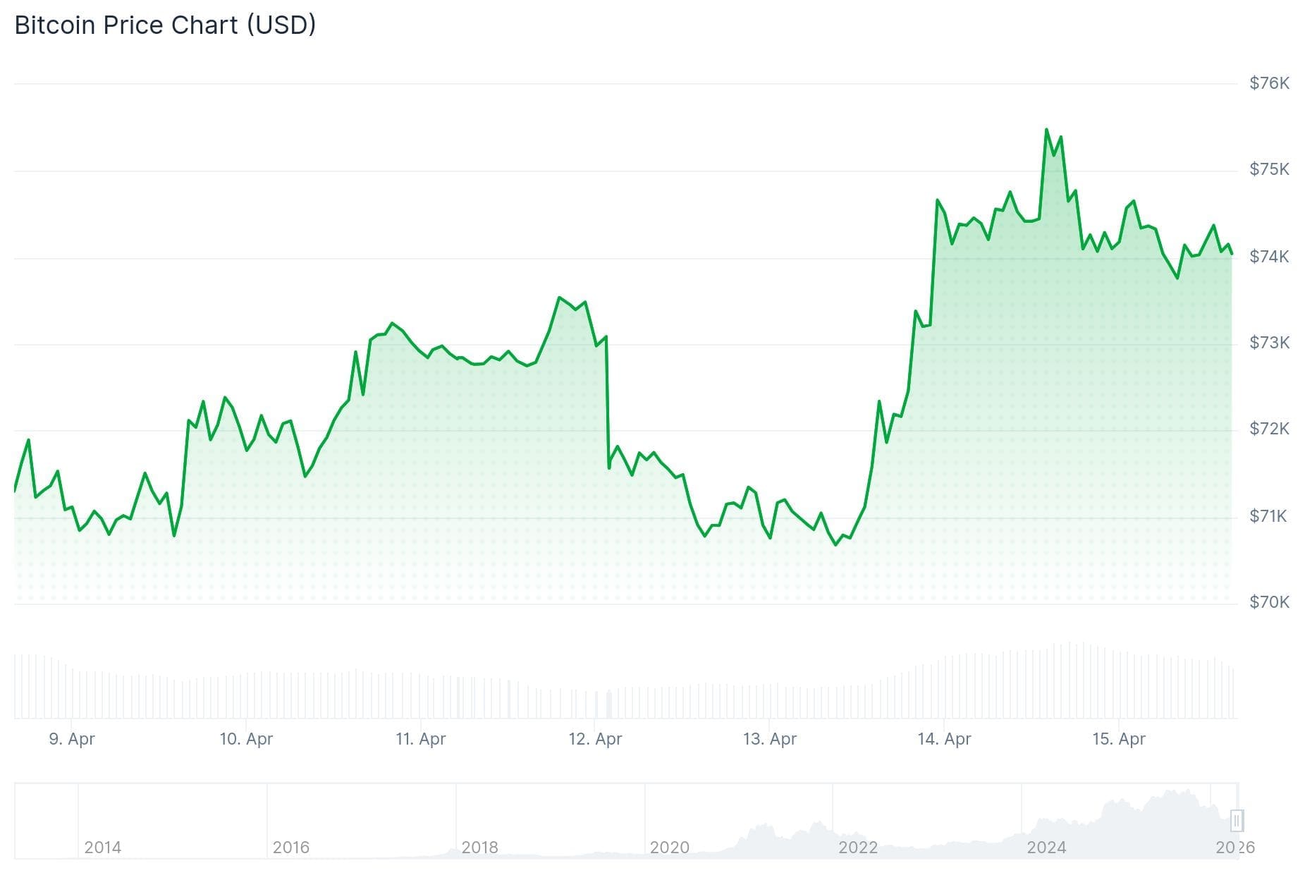 Na een piek van 76.000 dollar daalde de Bitcoin koers richting de 74.000 dollar. En vandaag is het de hele dag rond dit niveau gebleven.