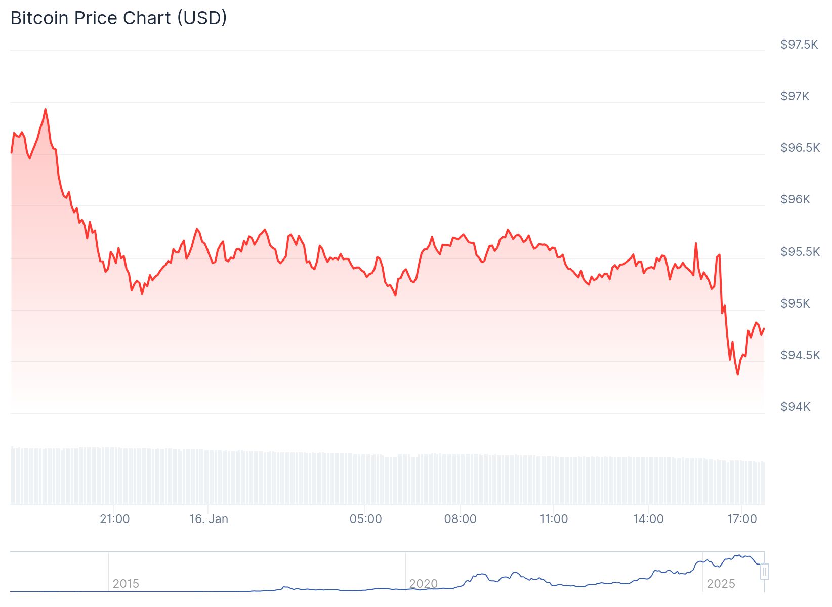 Binnen iets meer dan een halfuur daalde Bitcoin van 95.500 dollar naar een dieptepunt van 94.300 dollar. Dat komt neer op een val van iets meer dan 1 procent.