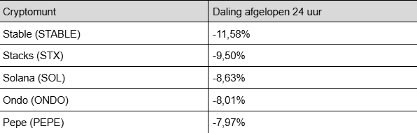 Andere grote munten doen het niet veel beter. Ripple (XRP) is 4,71 procent gedaald, Dogecoin (DOGE) 6,06 procent en Cardano (ADA) 5,81 procent. Solana (SOL) staat zelfs 9,54 procent lager dan gisteren.