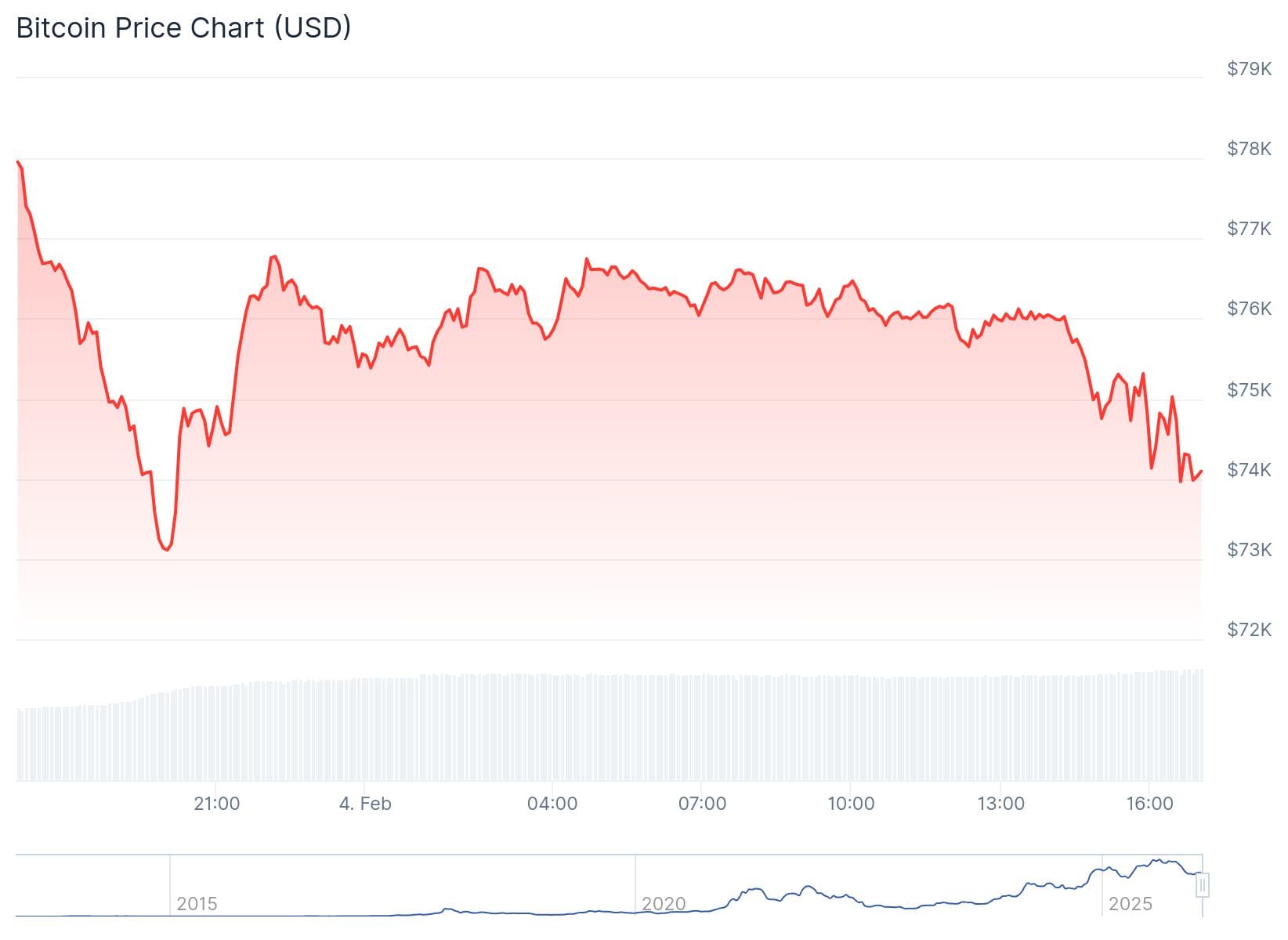 Gisteravond herstelde Bitcoin in een mum van tijd tot bijna 77.000 dollar, maar vanmiddag wordt die winst weer snel uit handen gegeven. Vooralsnog is 73.700 dollar het laagste punt van vandaag en dat betekent dat de koers al meer dan 4 procent is gezakt.