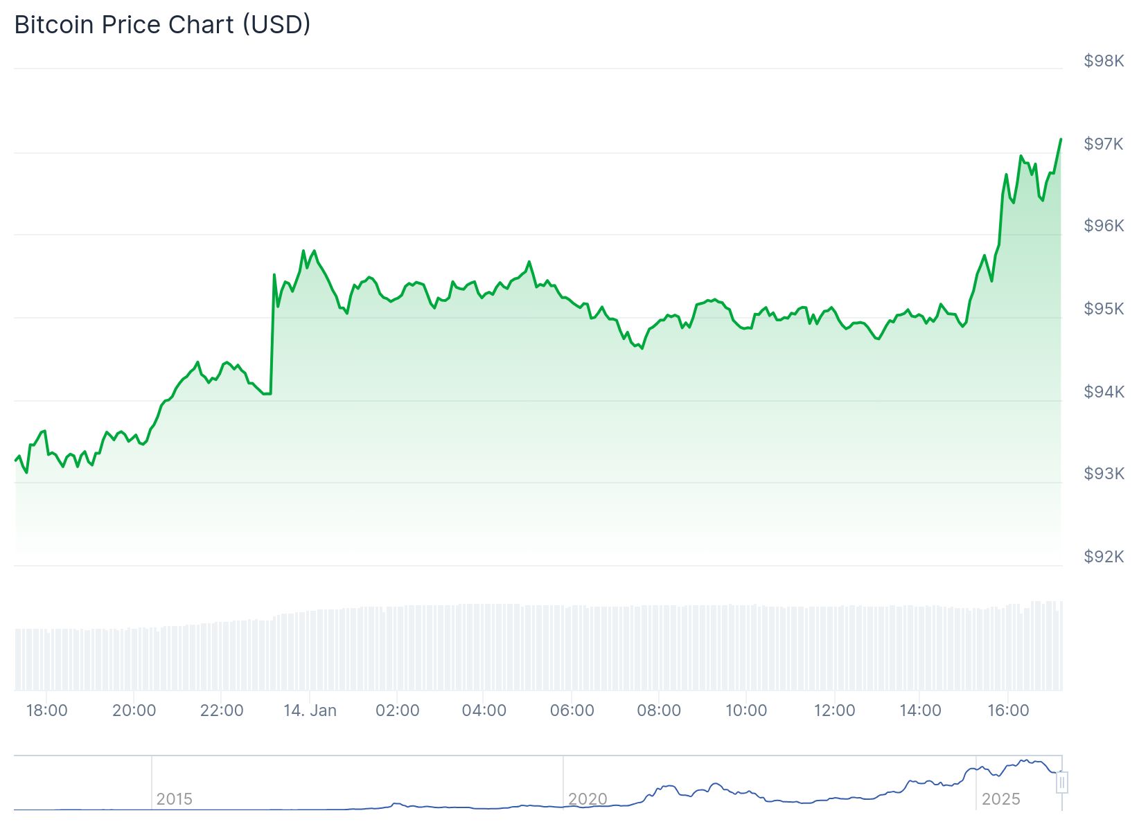 De Bitcoin koers heeft net als gisteren een hele goede dag. Voor het eerst sinds 14 november draagt de grootste cryptomunt weer een waarde van meer dan 97.000 dollar per stuk.