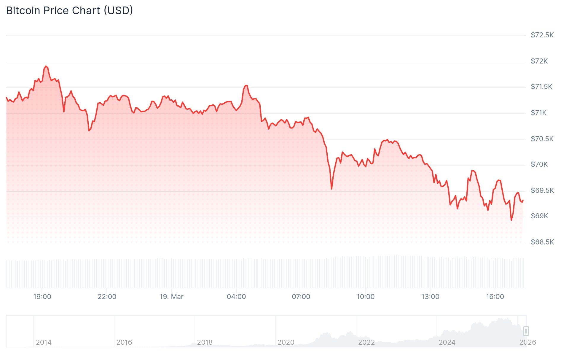 Op het moment van schrijven staat de BTC koers op 69.264 dollar, 2,77 procent lager dan 24 uur geleden. In euro’s wordt er nu 60.092 betaald voor de grootste crypto.