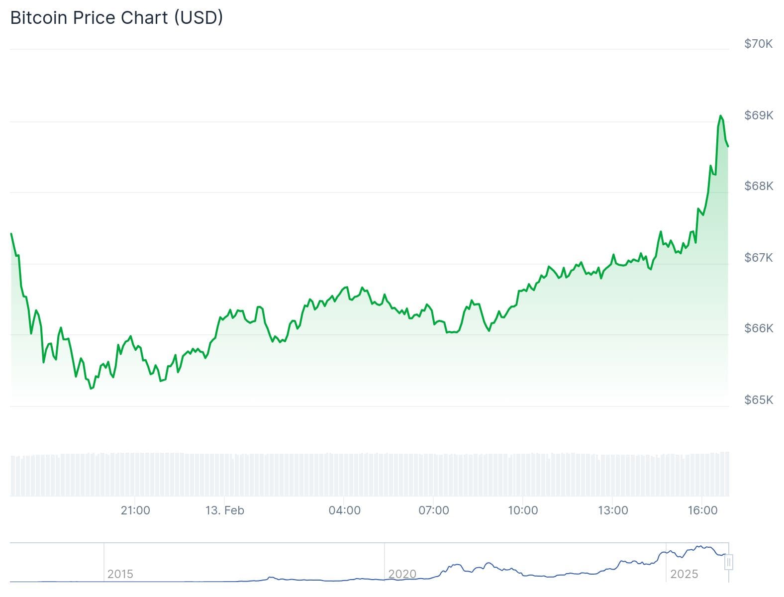 Het laatste zetje werd gegeven door de gunstige consumentenprijsindex (CPI) van de maand januari. Om 14:30 uur werden de cijfers bekendgemaakt en op dat moment was Bitcoin nog 67.300 dollar waard.