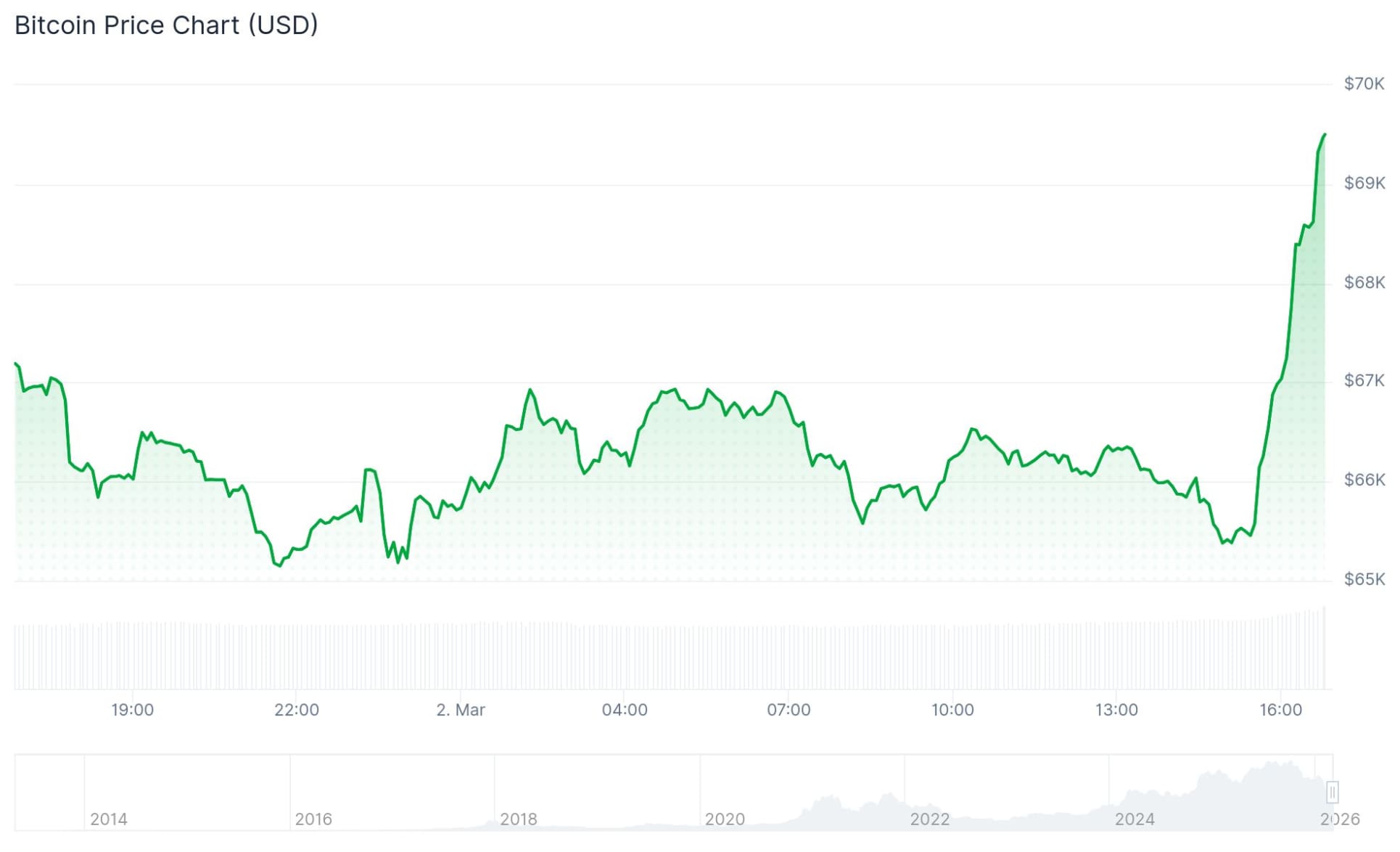 De Bitcoin koers is van 65.600 dollar naar een huidig niveau van 69.500 dollar geschoten. Dat is een indrukwekkende stijging van bijna 6 procent. Het is tevens het hoogste punt sinds 25 februari.