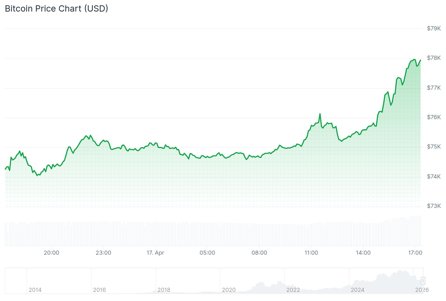 Rond 15:00 uur kwam het grote nieuws naar buiten en in twee uur tijd is de Bitcoin koers gestegen van 76.200 dollar naar een piek van 78.000 dollar. Dat is ook gelijk de hoogste stand sinds 3 februari.