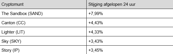 Er zijn wel een aantal munten die een sprong hebben gemaakt van enkele procenten. Hieronder de grootste top 100-stijgers van de afgelopen 24 uur: