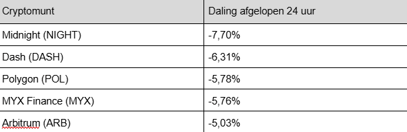 De meeste coins staan net als Bitcoin vandaag in de uitverkoop. Hieronder de grootste top 100-dalers van de afgelopen 24 uur:
