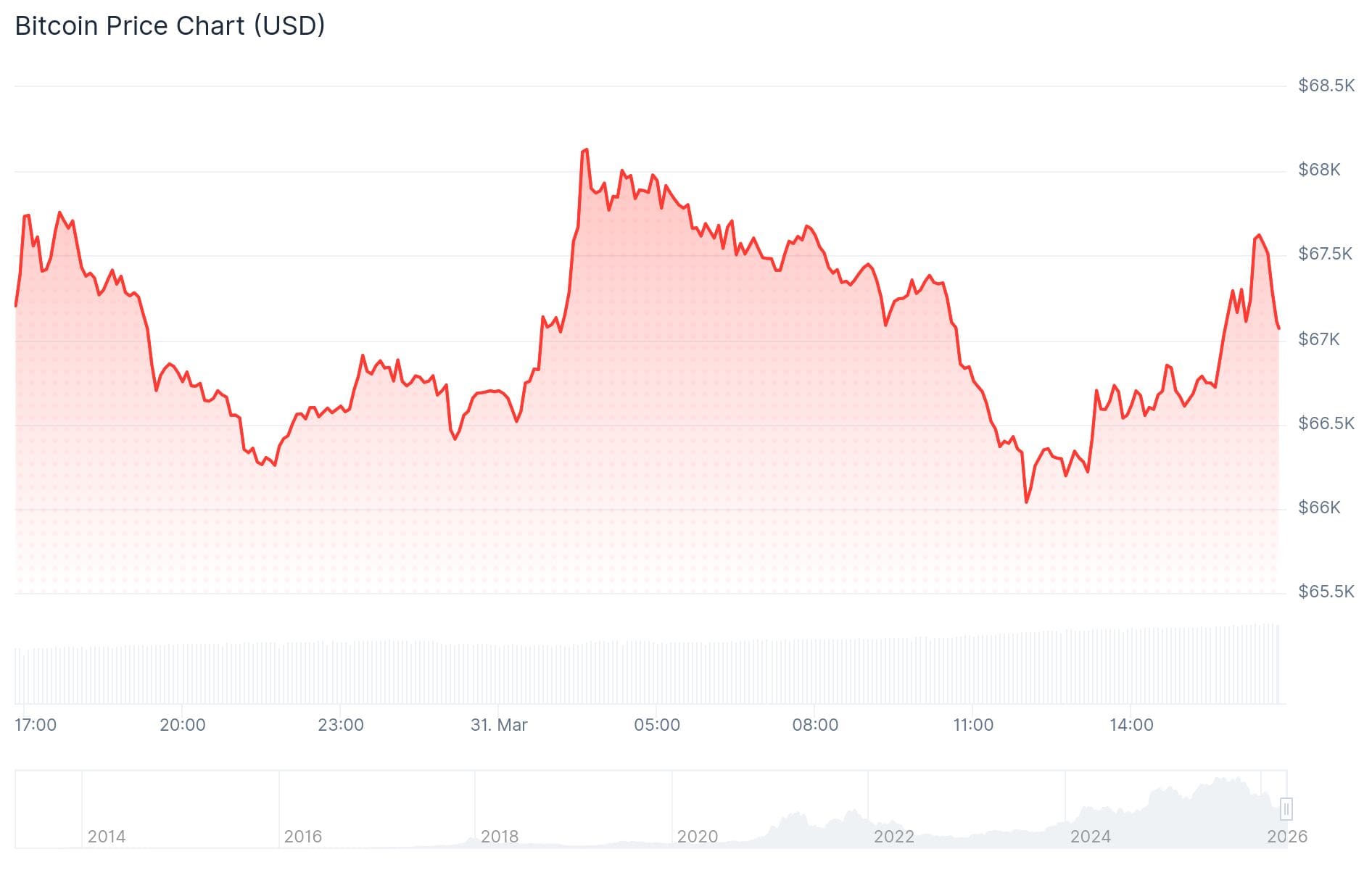 Tussen 10:00 uur en 12:00 werden er veel Bitcoins op de markt gedumpt. De koers daalde met meer dan 2 procent, van 67.500 dollar naar een dieptepunt van 66.000.