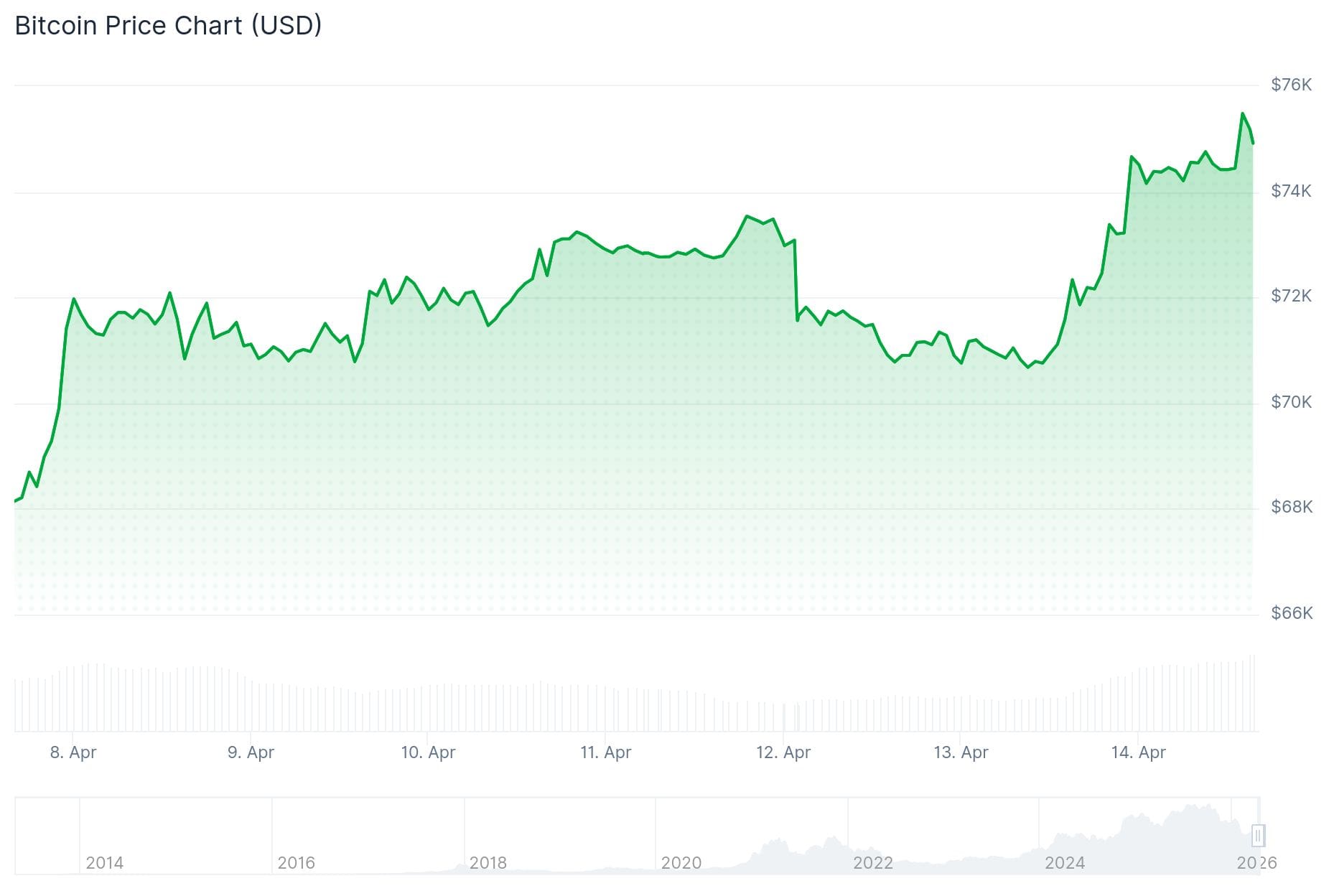 De opening van Wall Street om 15:30 uur gaf de koers nieuw leven. In een uur tijd ging Bitcoin met 2 procent omhoog van 74.600 dollar tot net boven de 76.000 dollar. De piek is tientallen dollars hoger uitgevallen dan waar de koers een paar weken terug strandde.