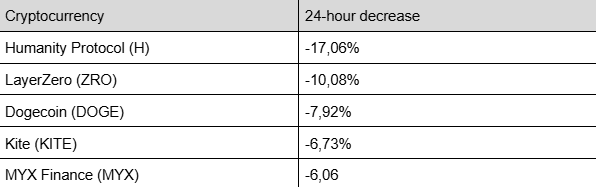 Ethereum (ETH) staat 2,77 procent lager, Ripple (XRP) 3,59 procent, Solana (SOL) 8,42 procent en Dogecoin (DOGE) zelfs 7,92 procent.