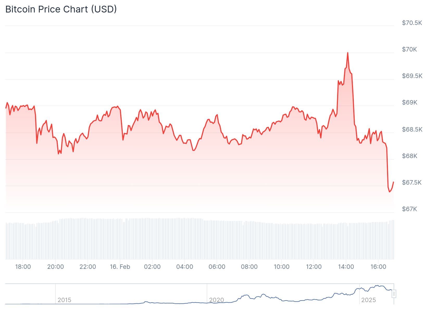 Vanochtend stond het net boven de 68.000 dollar, maar aan het begin van de middag werd de 70.000 dollar gekust. In zo’n anderhalfuur schoot het met meer dan 2 procent omhoog, maar het had maar een halfuurtje nodig om de winst te laten verdampen. Daar bleef het niet bij, want een paar uur later volgde opnieuw een scherpe daling.