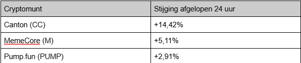 Er is maar een handjevol munten die vandaag met een positief resultaat voor de dag komen. Hieronder de grootste top 100-stijgers van de afgelopen 24 uur: