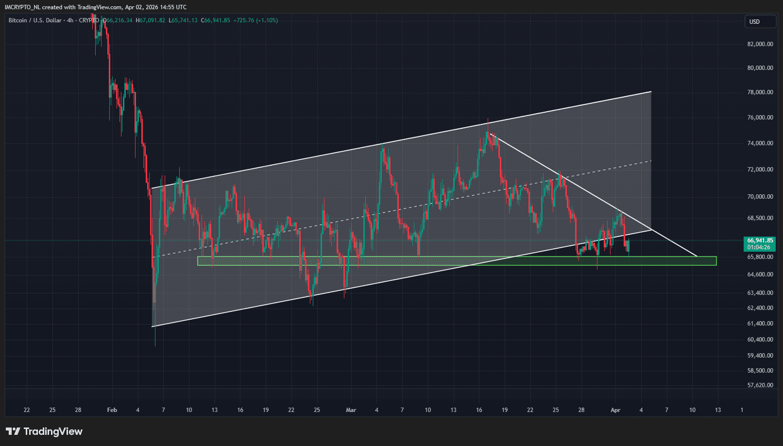Toch is er ook goed nieuws. Het steunniveau van net onder de 66.000 dollar houdt vooralsnog stand. De koers heeft inmiddels de 67.000 dollar alweer binnen handbereik en daarmee nadert ook de onderkant van de bear flag. Een doorbraak boven die lijn zou een belangrijke overwinning zijn voor de bulls.