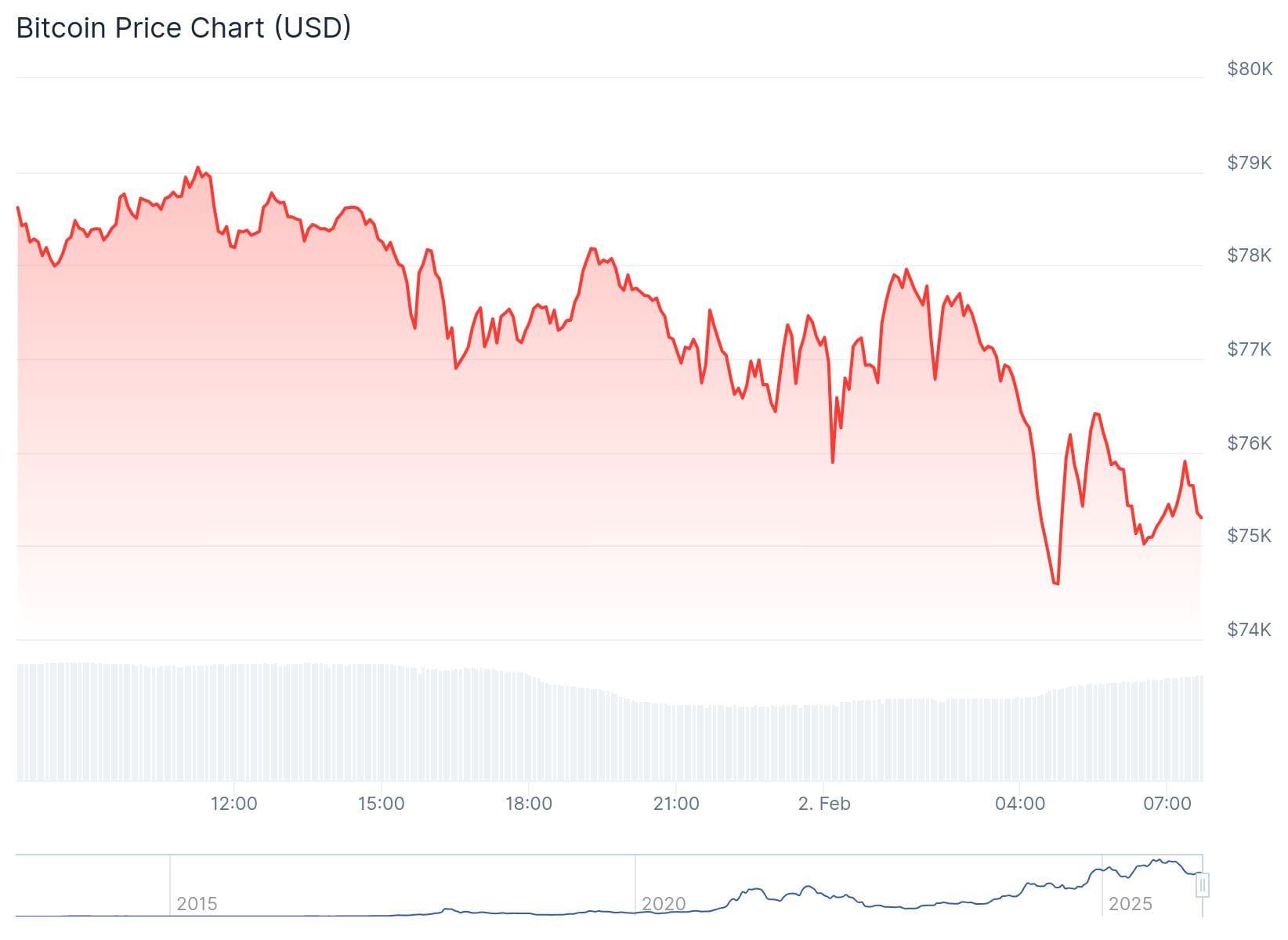 De Bitcoin koers is onder de 75.000 dollar gedoken en het scheelde maar een haartje of dat was de laagste stand sinds november vorig jaar.Â