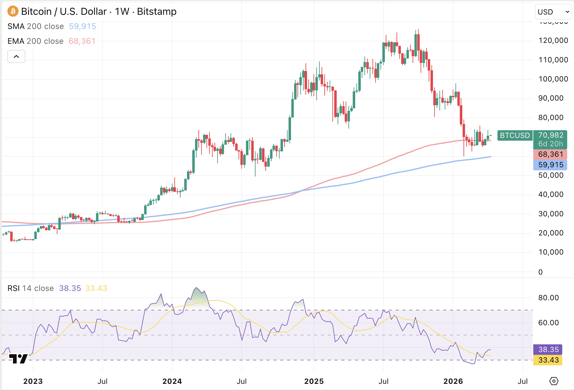 Voorlopig reageert de Bitcoin koers kalm op de ontwikkelingen. De koers wist zondag boven het 200-weekse exponentiële koersgemiddelde te sluiten. Dat gemiddelde ligt op 68.361 dollar en vormt een belangrijke scheidslijn tussen bull- en bearmarkten.