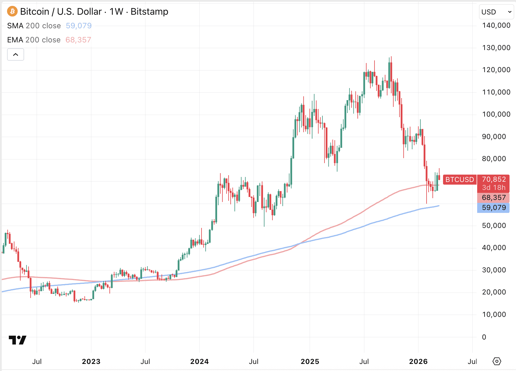 Dat koersgemiddelde ligt momenteel op 68.357 dollar. Daar handelt Bitcoin met de koers van 70.852 dollar nog steeds boven. Het zou een krachtig signaal zijn als Bitcoin daar ook deze week boven weet te sluiten.