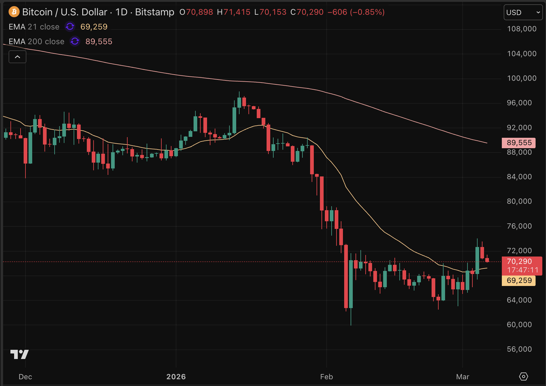 De Bitcoin koers is over de afgelopen 24 uur bijna 3 procent verloren en handelt momenteel op 70.405 dollar. Daarmee is Bitcoin vanuit meerdere perspectieven op een belangrijk steunpunt aangekomen. Het momentum leek terug te keren, maar als de week boven het niveau van 70.000 dollar weet te sluiten, zou dat een heel sterk signaal zijn.