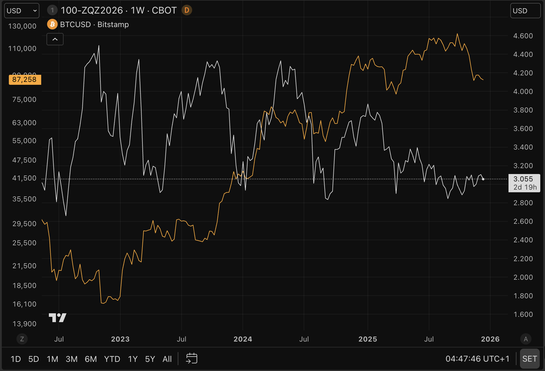 De grafiek hieronder toont de verwachte eindrente voor 2026 (wit) versus de Bitcoin koers (oranje). Vaak reageert Bitcoin iets verlaat met een koersdaling op een stijging van de verwachte eindrente (minder renteverlagingen), en doet de koers het juist goed als deze daalt (meer renteverlagingen).