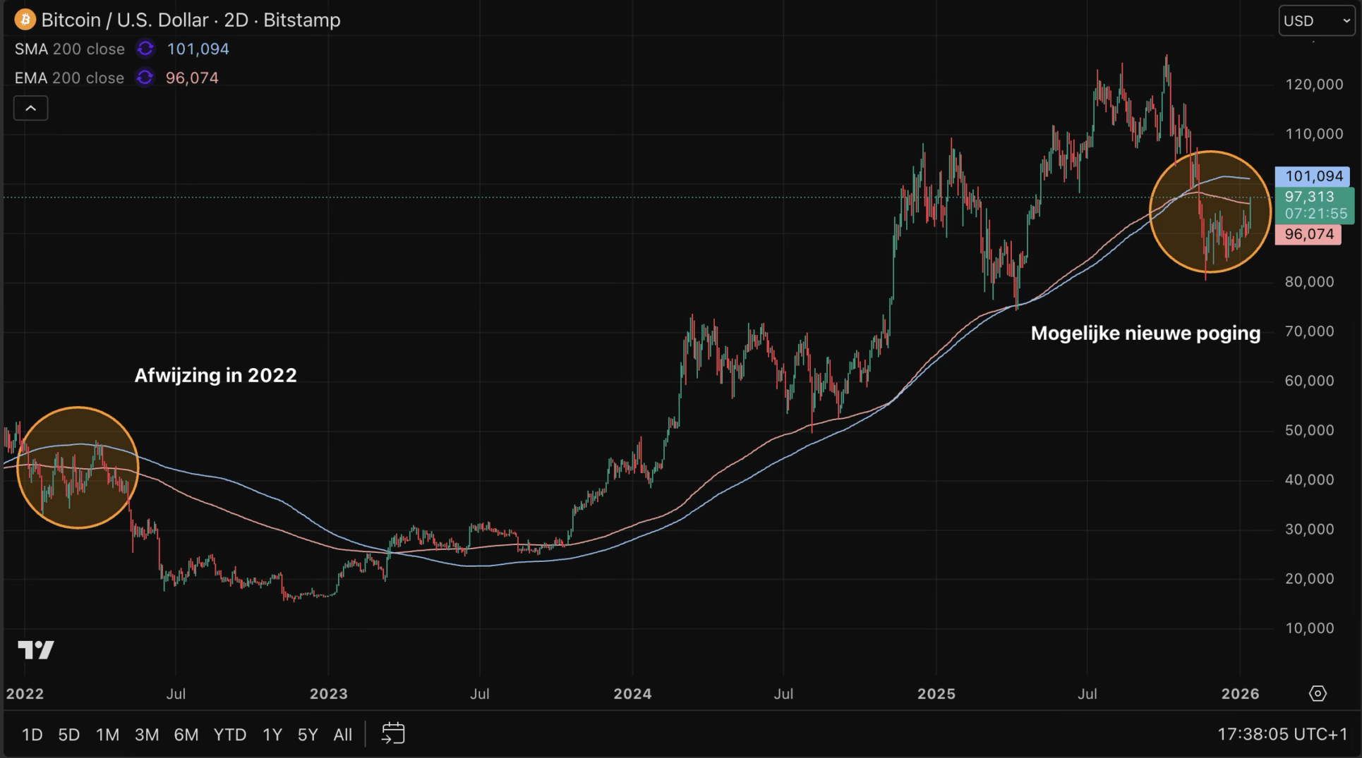 Nu lijkt de koers een poging te wagen om ze te herpakken. Het eerste gemiddelde op 96.000 dollar is “heroverd”, terwijl het tweede gemiddelde op 101.000 dollar nog onaangetast is. Het is nu zaak dat Bitcoin boven dit niveau komt (en blijft), en niet afgewezen wordt, zoals we in 2022 zagen gebeuren.