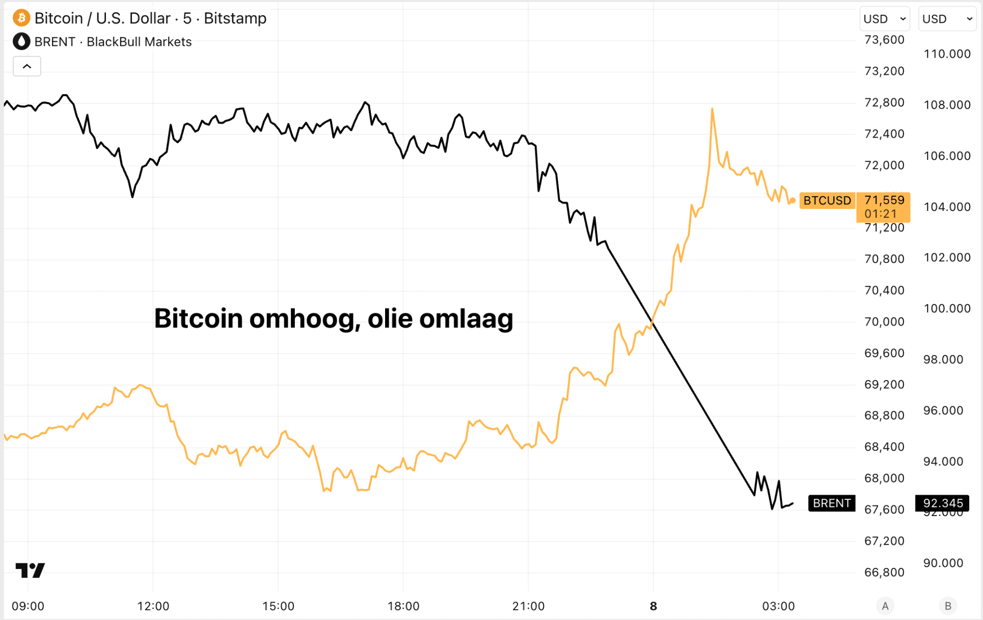 Na dat nieuws viel de olieprijs flink omlaag, terwijl Bitcoin (BTC) tijdelijk naar bijna 73.000 dollar wist te stijgen. Het moge duidelijk zijn dat het voor de markt een gigantische opluchting is dat het conflict vannacht niet verder escaleerde.