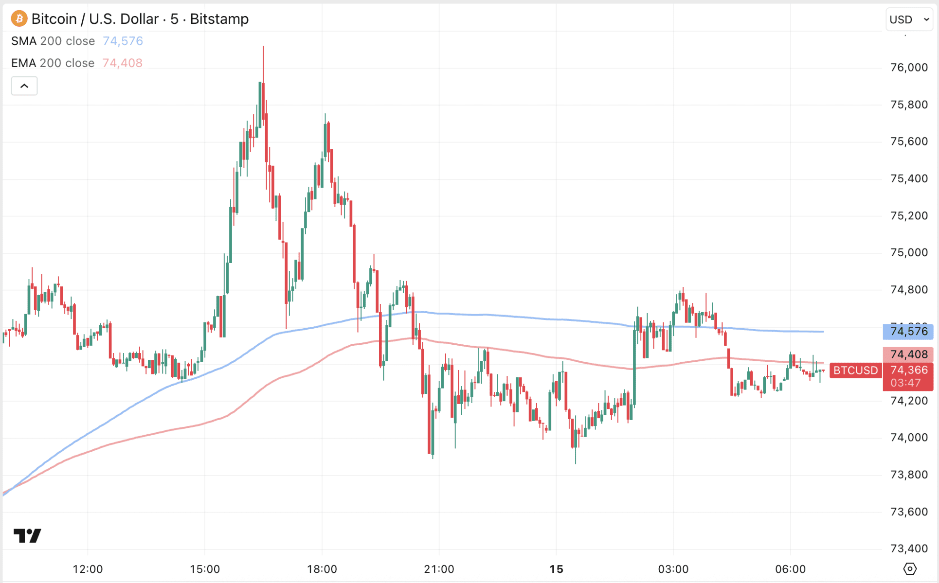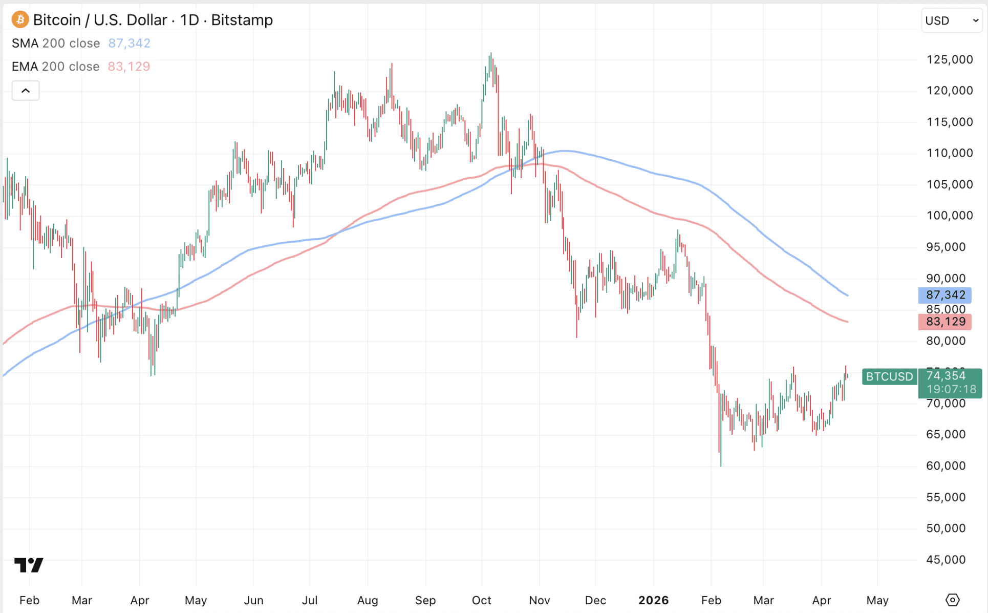 De Bitcoin koers handelt vandaag stabiel op 74.300 dollar. Toch lijkt de algemene richting omhoog. Gisteren tikte de digitale munt het niveau van 76.000 dollar aan. Daarmee probeert Bitcoin (BTC) duidelijk een einde aan de bullmarkt te maken. Veel zal echter afhangen van de verdere afwikkeling van de Iran-oorlog, waar nu opnieuw positieve berichten over naar buiten komen.
