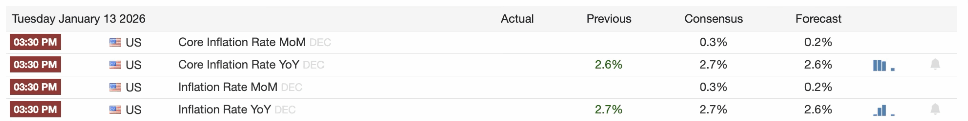 Voor nu is de consensus dat de inflatie net als vorige maand binnenkomt op 2,7 procent, en dat de kerninflatie (CPI minus voedsel en energie) ook op 2,7 procent uitkomt. Dat zou een stijging van 0,1 procent opleveren ten opzichte van afgelopen maand.