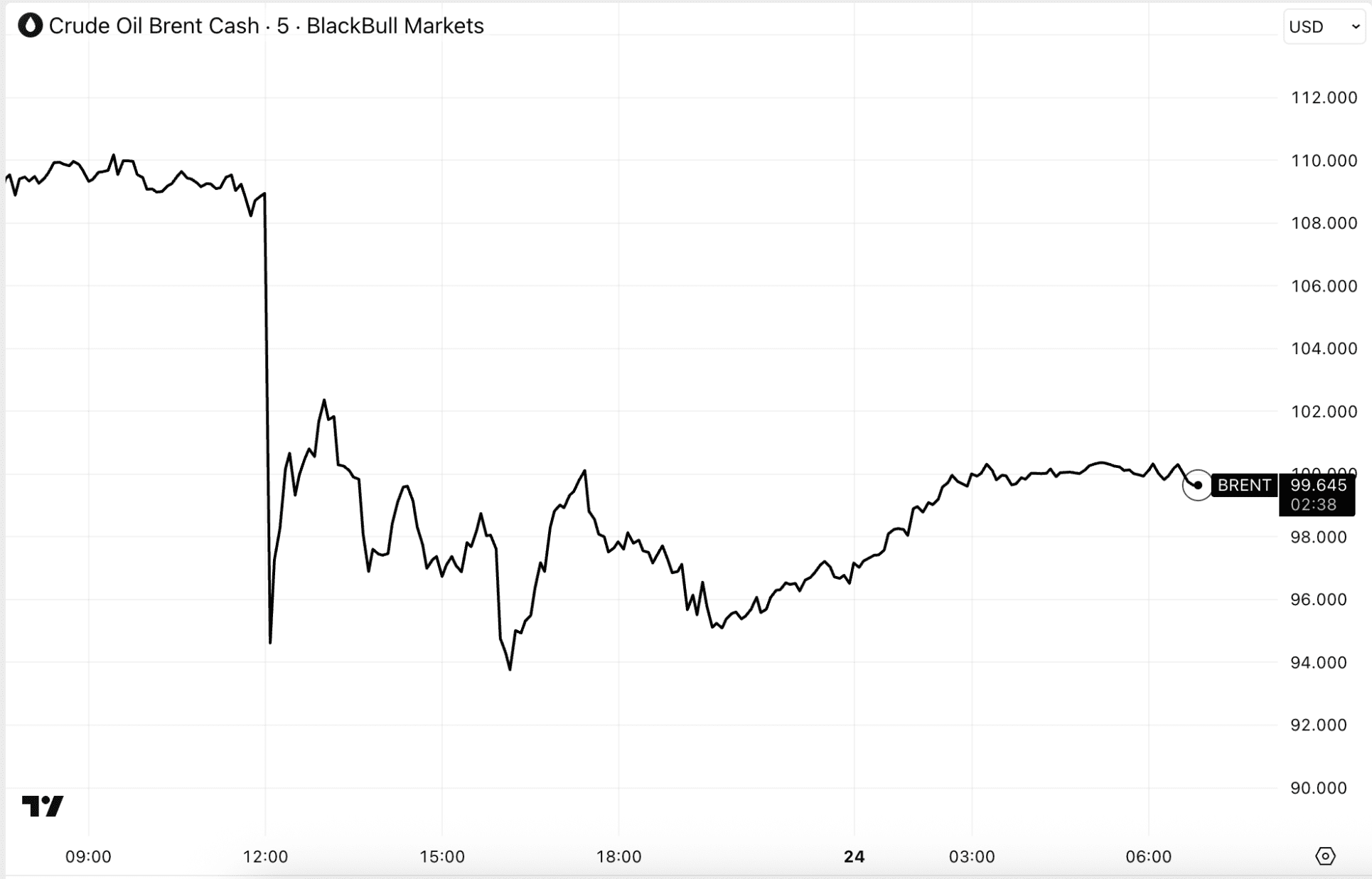 De olieprijs dook gisteren onder de 100 dollar na de aankondiging van Donald Trump. Inmiddels is de prijs echter weer naar dat niveau gekropen.