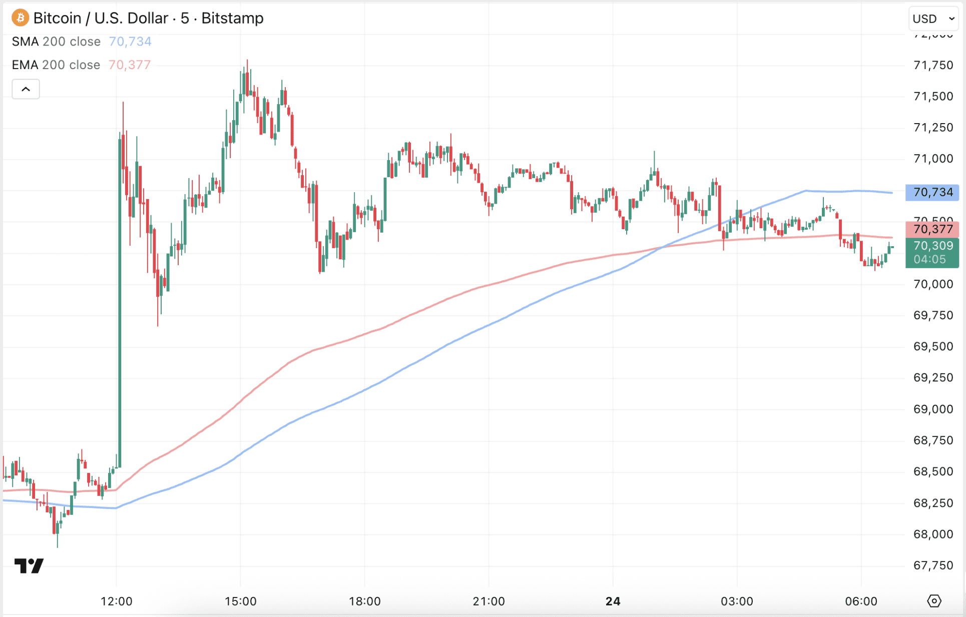 De Bitcoin koers handelt op 70.300 dollar en staat daarmee bijna 3 procent hoger dan gisteren. Rond het middaguur schoten Bitcoin en de rest van de financiële markt omhoog, nadat Donald Trump plotseling sprak over goede gesprekken met Iran. Het einde van de oorlog zou aanstaande zijn. Totdat Iran dat vrij snel daarna ontkende.