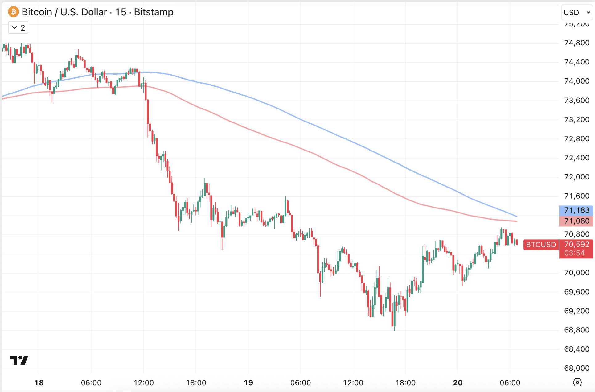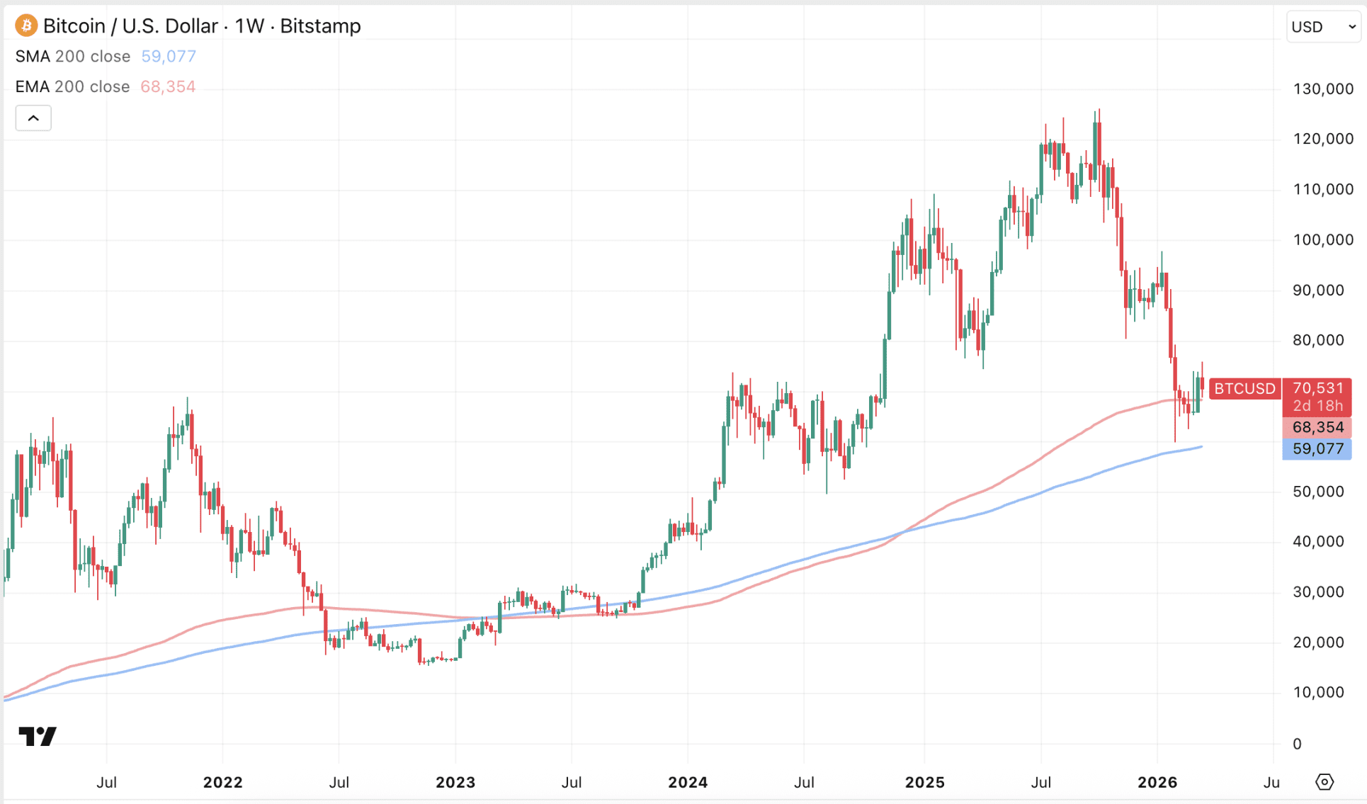 Afgelopen week wist Bitcoin namelijk een weekslot boven het 200-weekse exponentiële koersgemiddelde te realiseren. Dat gemiddelde ligt momenteel op 68.354 dollar, terwijl de koers dus op 70.500 dollar handelt.