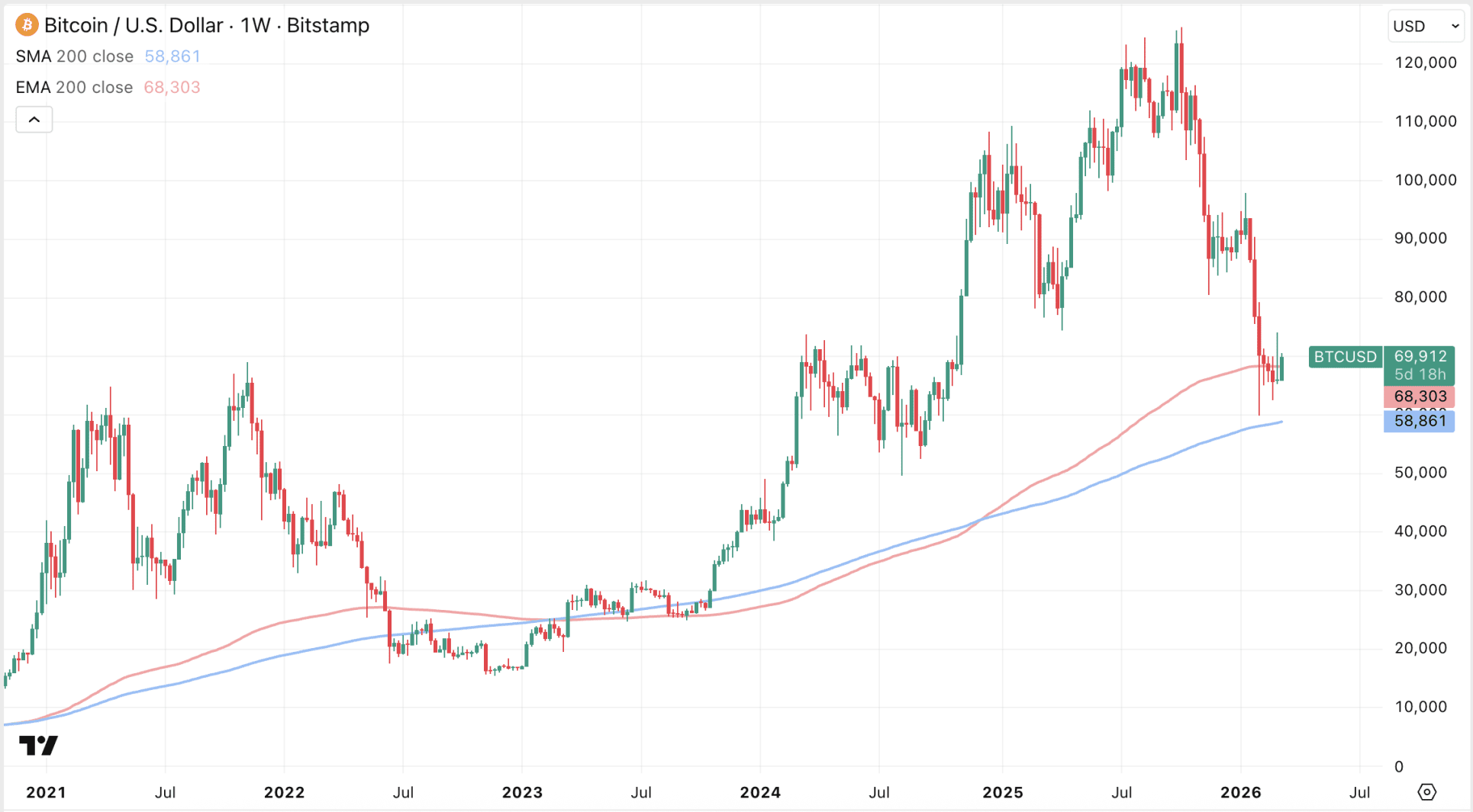 Terwijl het conflict in Iran mogelijk niet lang meer duurt, zien we de Bitcoin koers op de achtergrond een belangrijk niveau bereiken. Bitcoin handelt momenteel op 69.912 dollar en daarmee boven het belangrijke 200-weekse exponentiële koersgemiddelde (rode lijn) op 68.303 dollar.