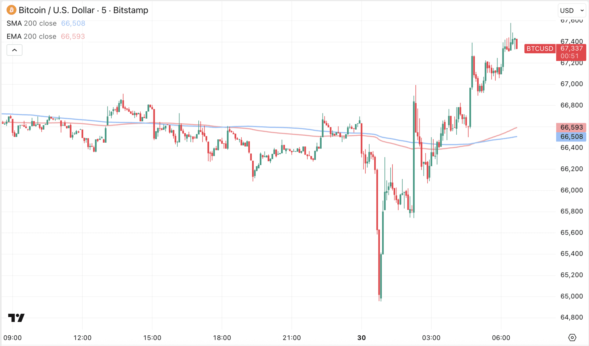 De Bitcoin koers is sterk aan de nieuwe week begonnen, ondanks dat Brent-olie ruim 3 procent steeg naar 116 dollar per vat is gestegen. Voor Bitcoin (BTC) staat er nu een stijging van ongeveer 1 procent over de afgelopen 24 uur, wat de prijs op 67.381 dollar brengt. Ondertussen roept Donald Trump dat hij de olie in Iran in beslag wil nemen.