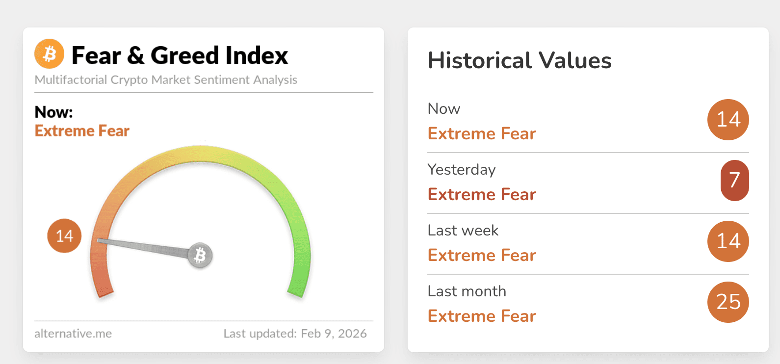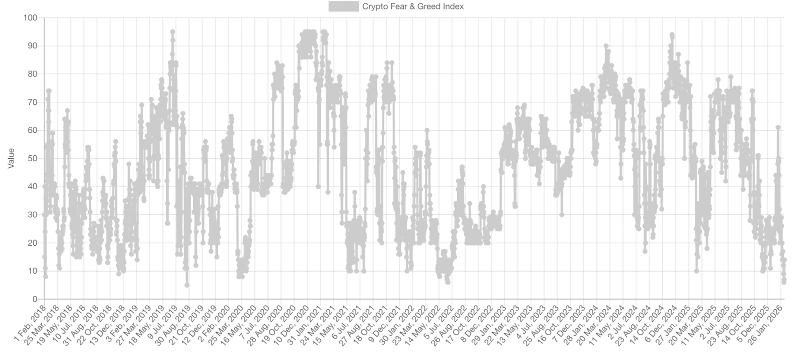 De huidige angst is het gevolg van forse dalingen in de markt. Zo zakte Bitcoin op 6 februari nog onder de 60.000 dollar, voor het eerst sinds oktober 2024. Inmiddels is de koers weer opgekrabbeld naar ongeveer 69.300 dollar. Ethereum daalde eerder tot bijna 1.700 dollar, maar handelt inmiddels rond de 2.040 dollar.