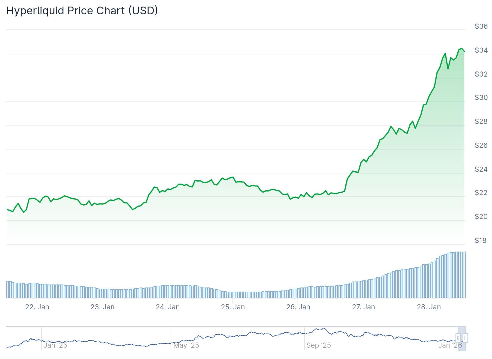 Aan het begin van de week handelde HYPE nog rond de 20 dollar. In korte tijd steeg de koers door richting 35 dollar, waarbij het handelsvolume flink toenam. Dit wijst erop dat steeds meer traders actief werden en inspeelden op het momentum. In vergelijking met Bitcoin, dat in dezelfde periode nauwelijks steeg, valt de prestatie van HYPE extra op.