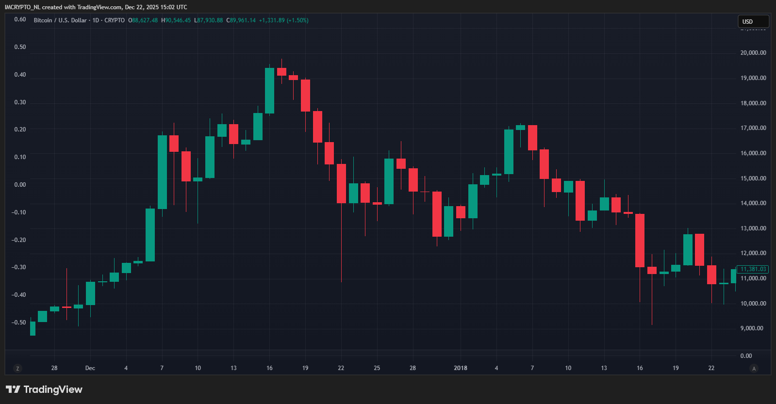 In de afgelopen maanden heeft de bekendste cryptomunt flink wat volatiliteit gezien. Van een all-time high op 6 oktober naar een flinke correctie die pas een bodem vond op 21 november. Hoewel de daling ruim 36 procent betrof, heeft Bitcoin (BTC) wel eens grotere correcties meegemaakt. Dit gebeurde bijvoorbeeld in de kerstperiode van 2017.