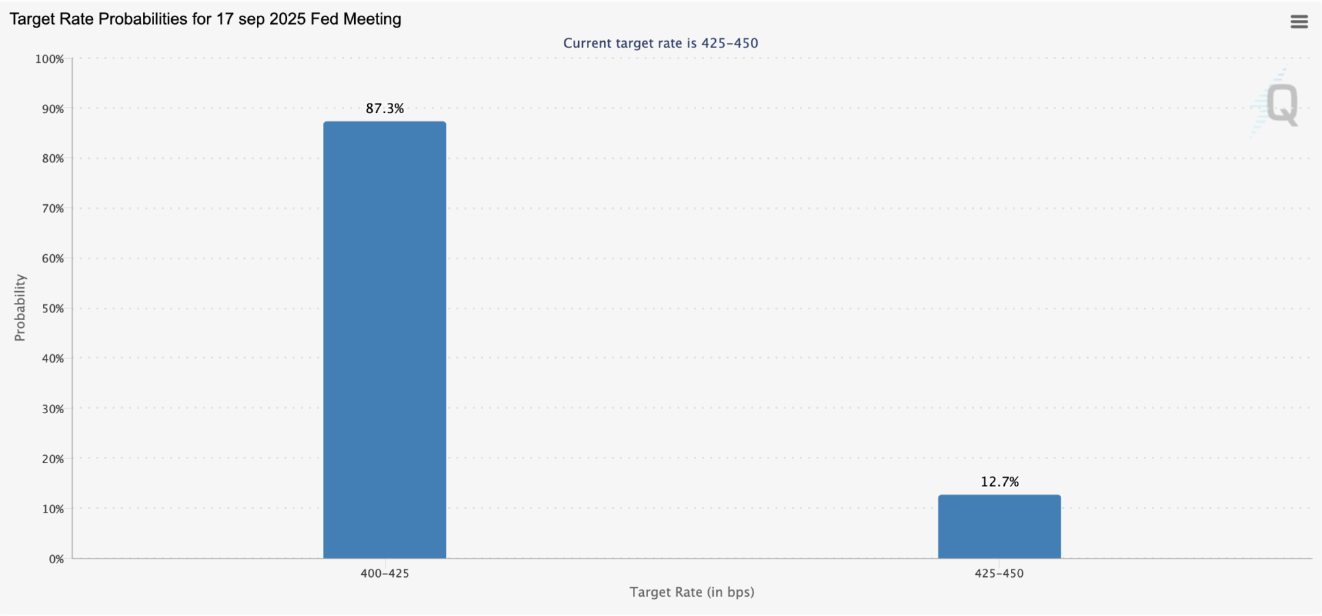 Alles wijst erop dat de Fed in september de rente opnieuw verlaagt, precies een jaar na de vorige verlaging. Op de futuresmarkt is de kans op een zogeheten ‘rate cut’ gestegen naar 87,3 procent.
