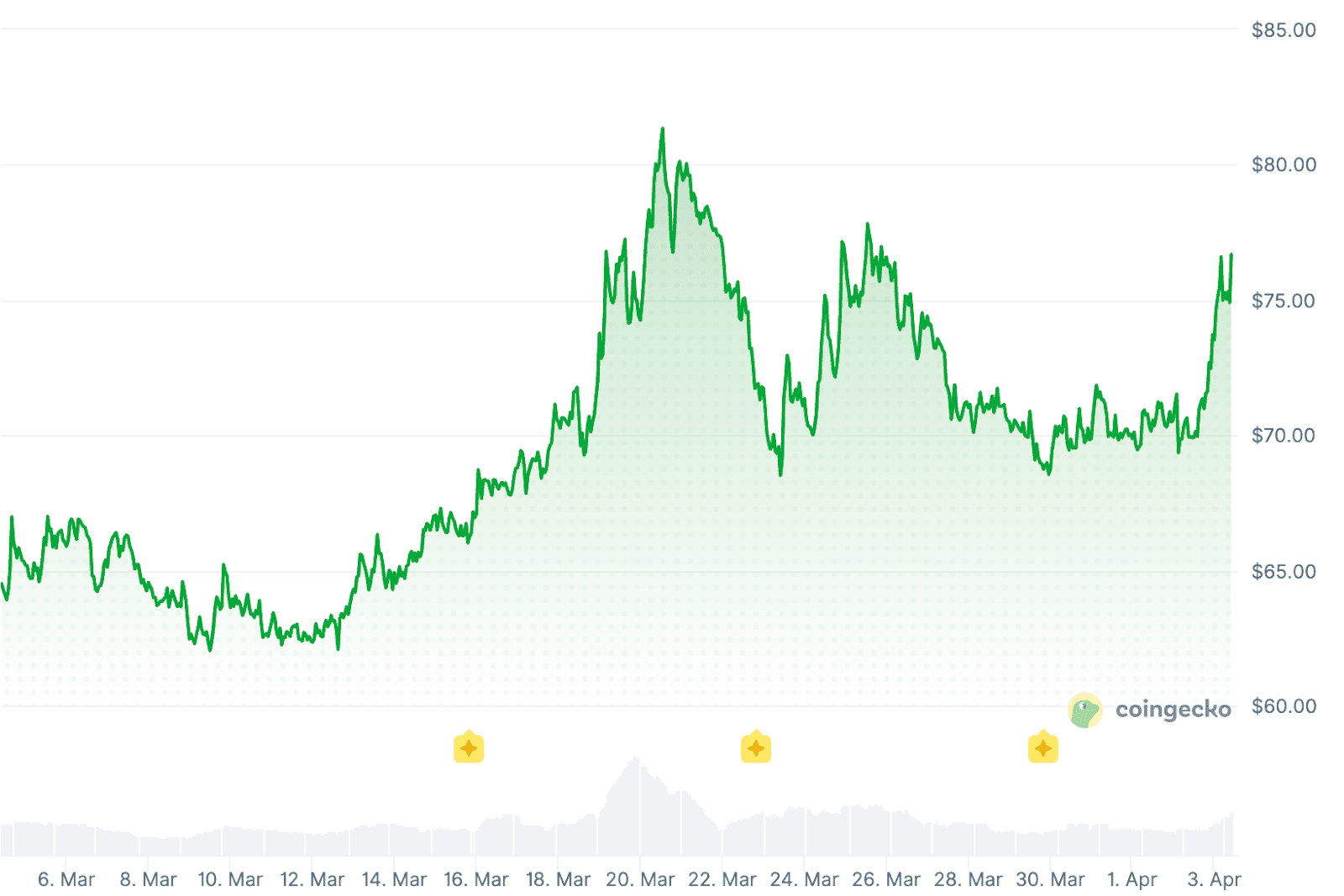 Ook bij QNT zien we een vergelijkbare trend sinds maart. Zo lag de koers ongeveer een maand geleden nog rond de 60 dollar, afhankelijk van het exacte moment. Inmiddels staat de prijs op 76,70 dollar, wat neerkomt op een stijging van bijna 28 procent.
