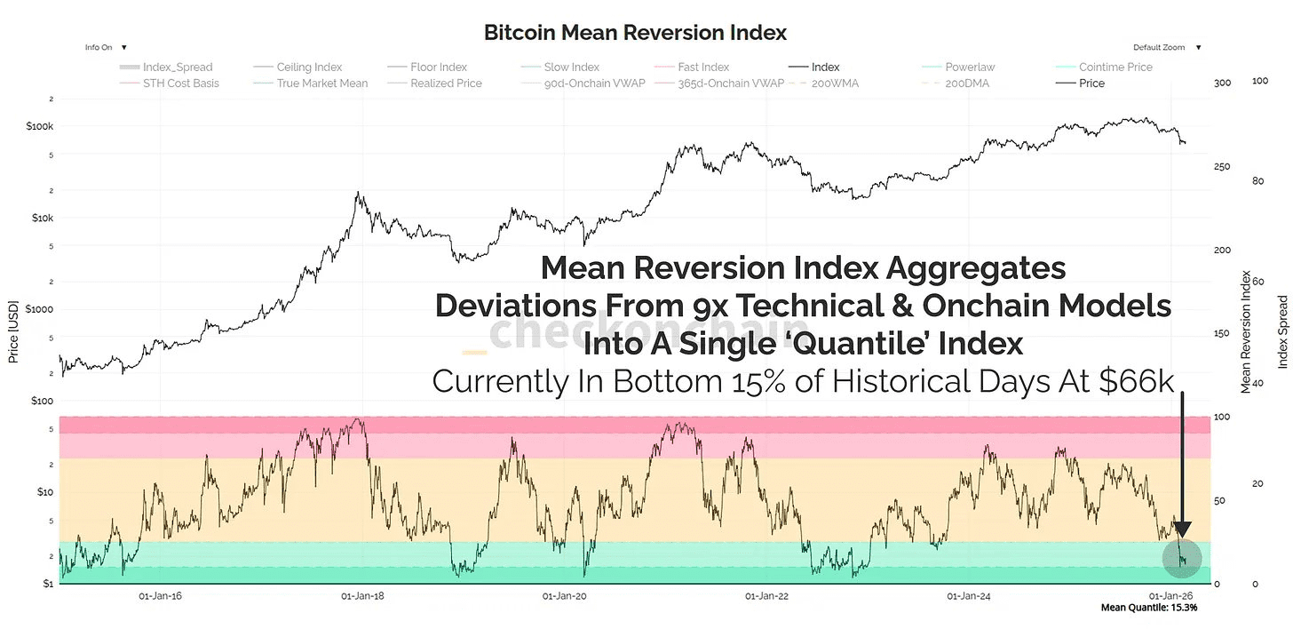 Volgens de Mean Reversion Index van James Check ligt de Bitcoin koers van rond de 66.000 dollar in een extreme zone. Deze index, die gebaseerd is op negen technische- en onchain-modellen, geeft eigenlijk aan dat Bitcoin momenteel in een koopzone zit.