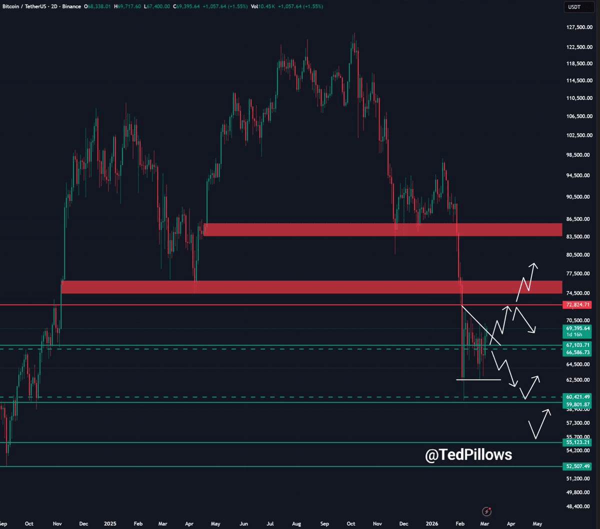 Als het Bitcoin niet lukt om stand te houden boven de 70.000 dollar, dan verwacht de populaire analist Ted Pillows een hertest van de koerzone van 65.000 tot 66.000 dollar.