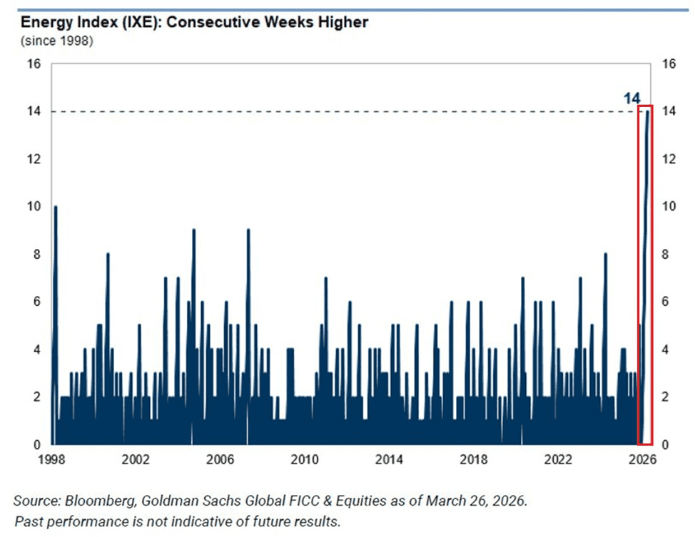 Het vorige record stond op tien opeenvolgende weken winst, gemeten in 1998. Die reeks is inmiddels overtuigend uit de boeken gespeeld. In de afgelopen veertien weken stroomde er bovendien 5,5 miljard dollar naar de Energy Sector ETF (XLE), het grootste energie-ETF op de Amerikaanse beurs.